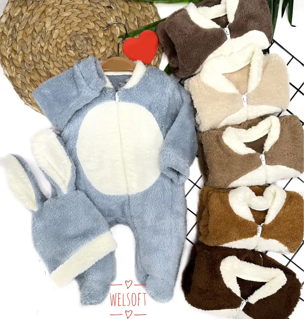 3-6-9-12 Ay Tavşan Kulak Şapkalı Fermuar Kapamalı Patikli Eldivenli Tüylü Erkek Bebek Tulumu