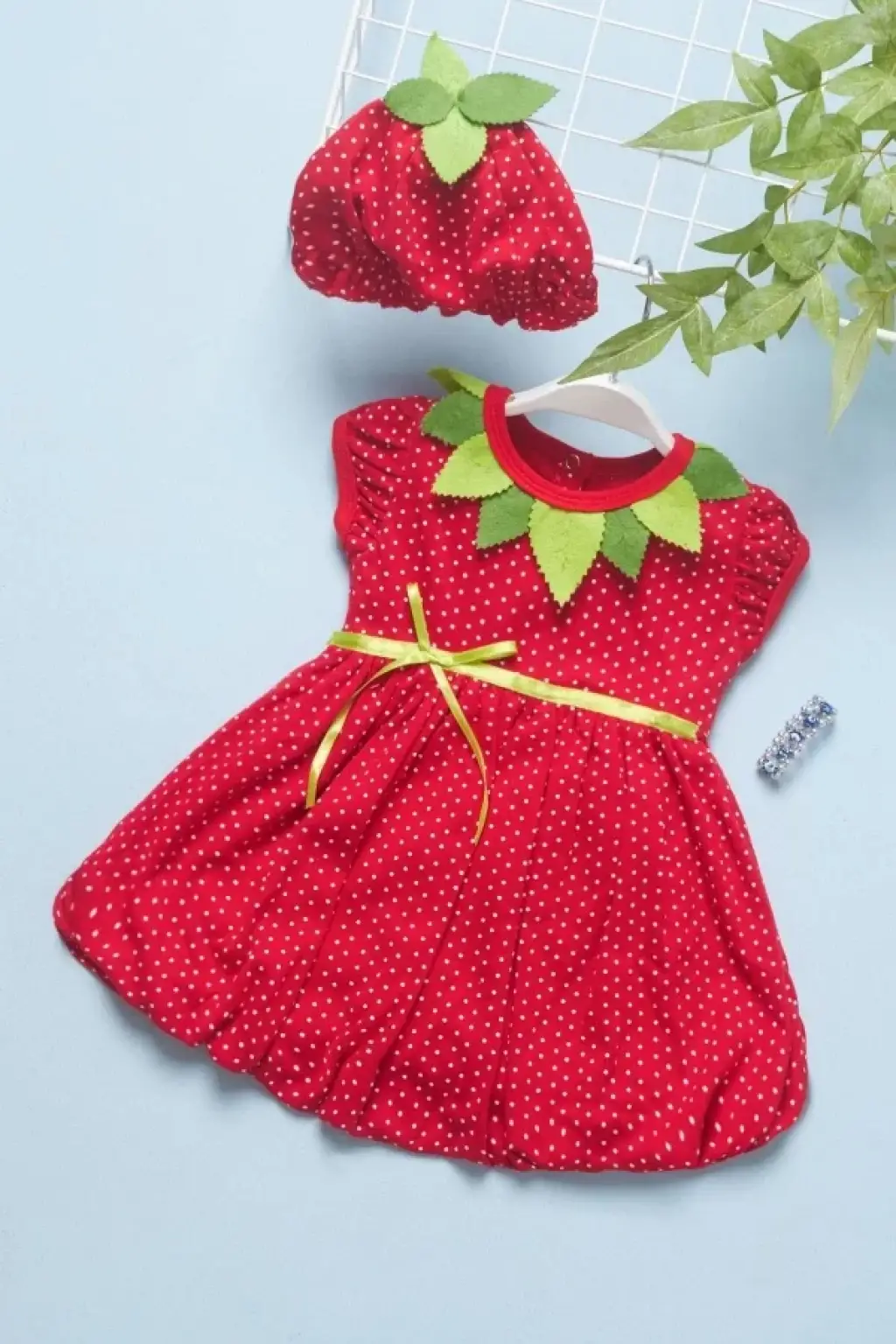 Omarı Çilek Desenli Bebek Elbisesi Kırmızı