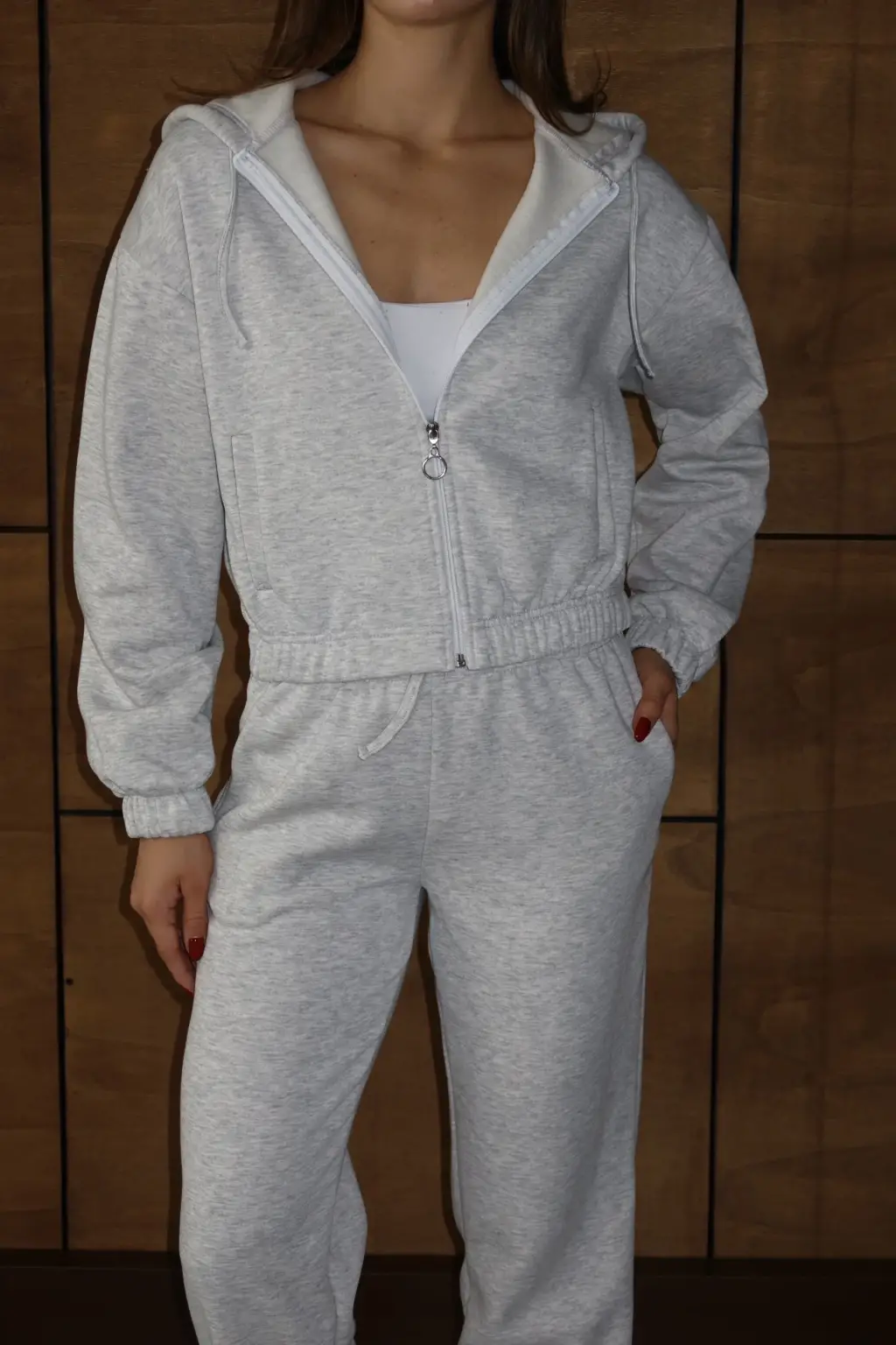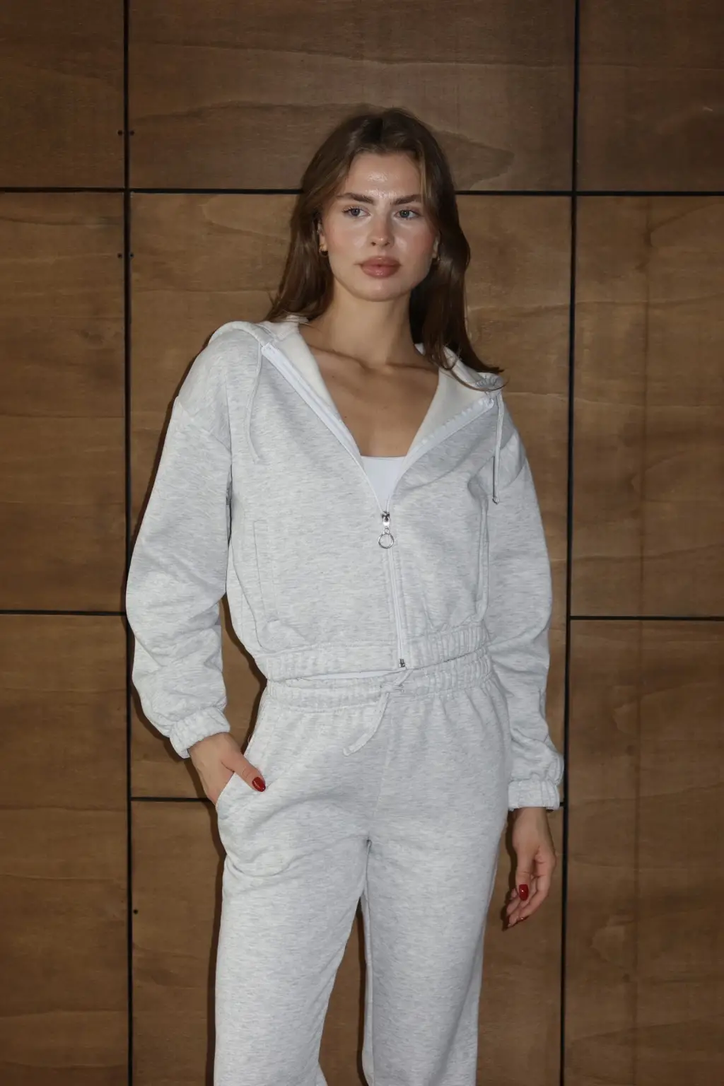 KAZAX markası tarafından tasarlanan 3 iplik şardonlu Kapşonlu fermuarlı kısa üst gri pat8590, kadın giyim koleksiyonuna şıklık ve konfor katıyor.