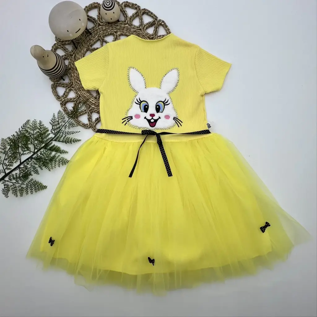 Omarı Payetli Tavşan Desenli Sarı Kız Çocuk Elbisesi