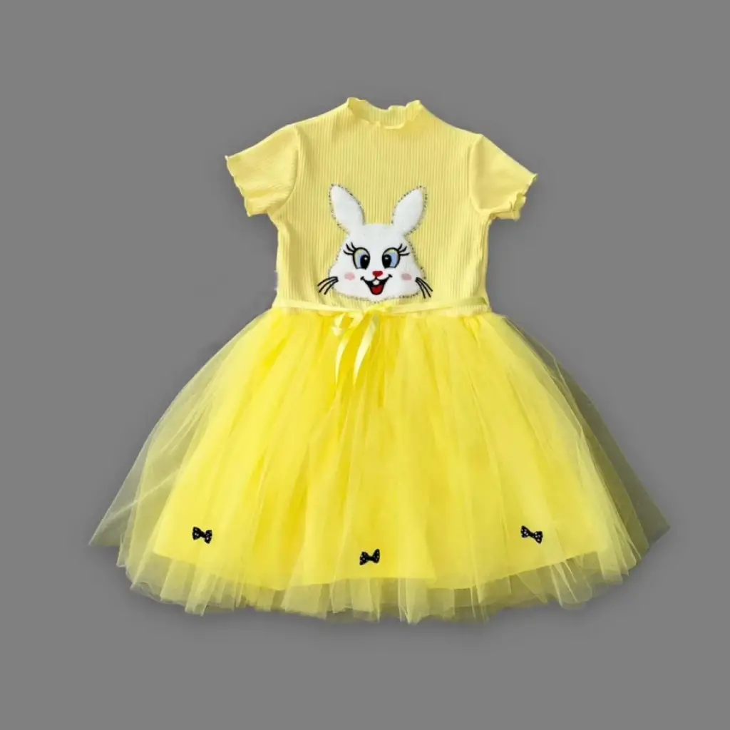 5-6-7 Yaş Payetli Tavşan Baskılı Kız Çocuk Elbisesi