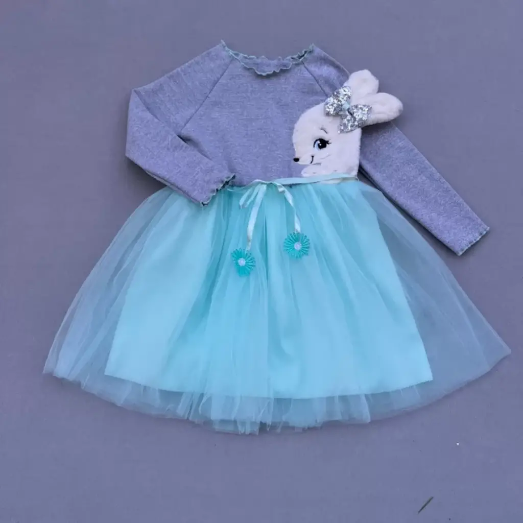 Omarı Turkuaz Renkli Pelüş Tavşan Desenli Çocuk Tütü Elbise