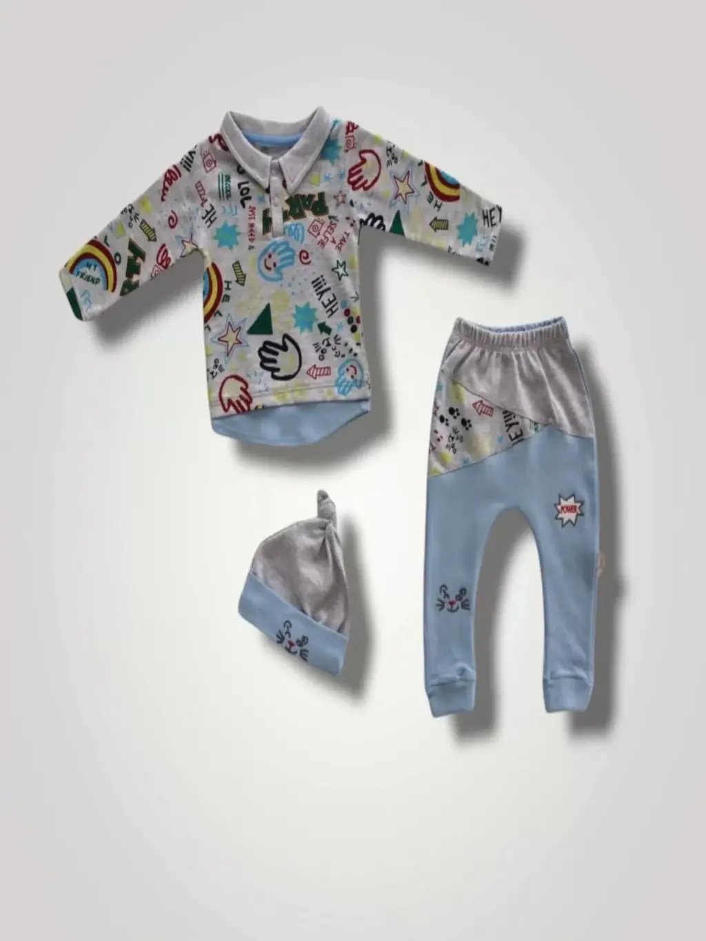6-9 12-18 18-24 Ay Power Kedi Nakışlı Uzun Kollu Sweat Şapkalı 3lü Kız Erkek Bebek Takımı