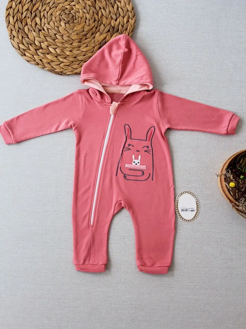 Omarı Yumuşak Kapşonlu Tavşan Nakışlı Bebek Tulumu Pembe