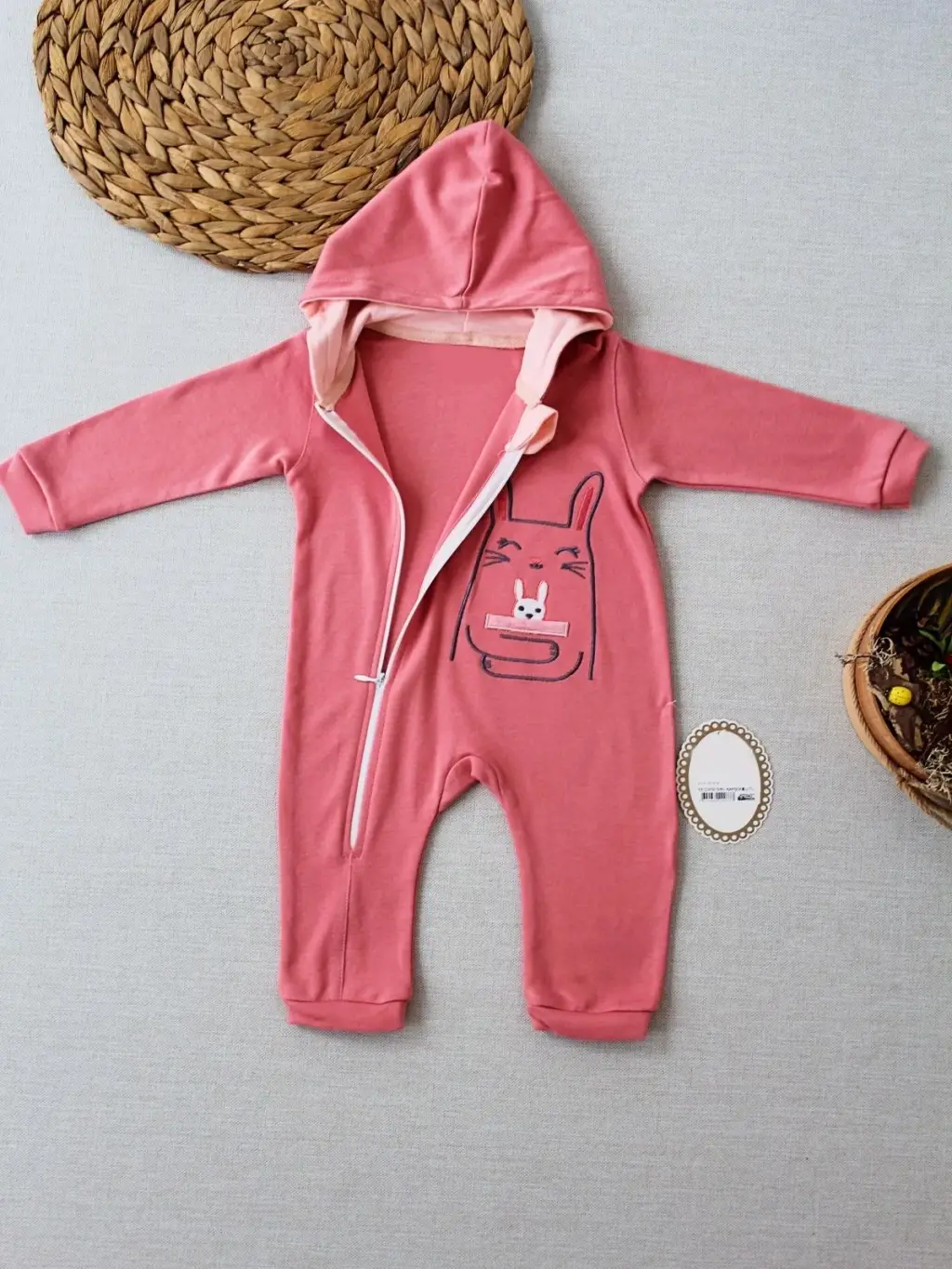 Omarı Tavşan Nakışlı Kapşonlu Bebek Tulumu
