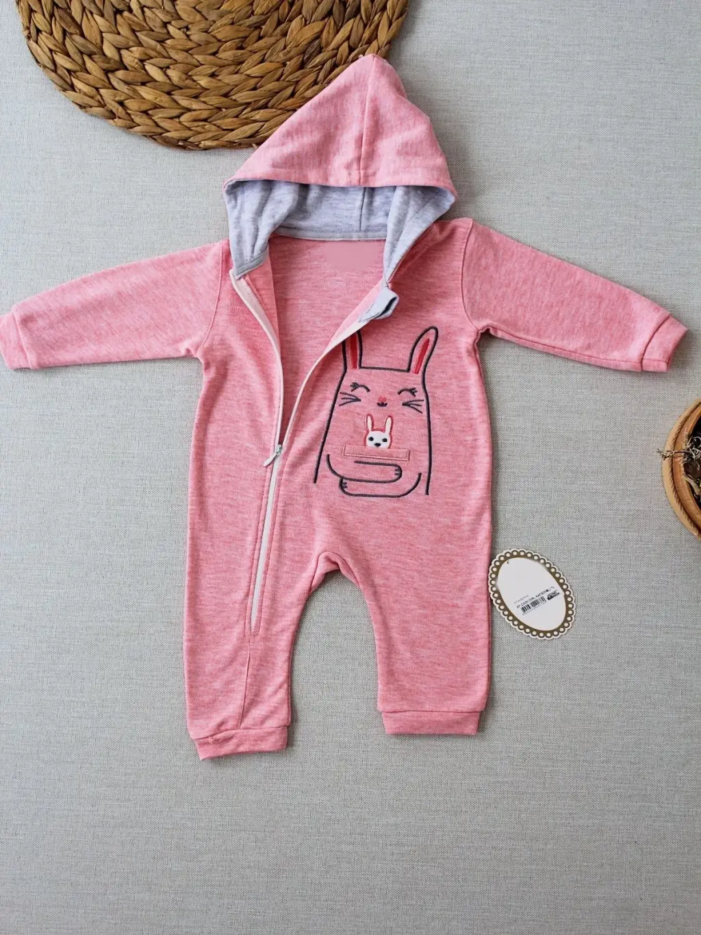 Omarı Tavşan Nakışlı Kapşonlu Bebek Tulumu