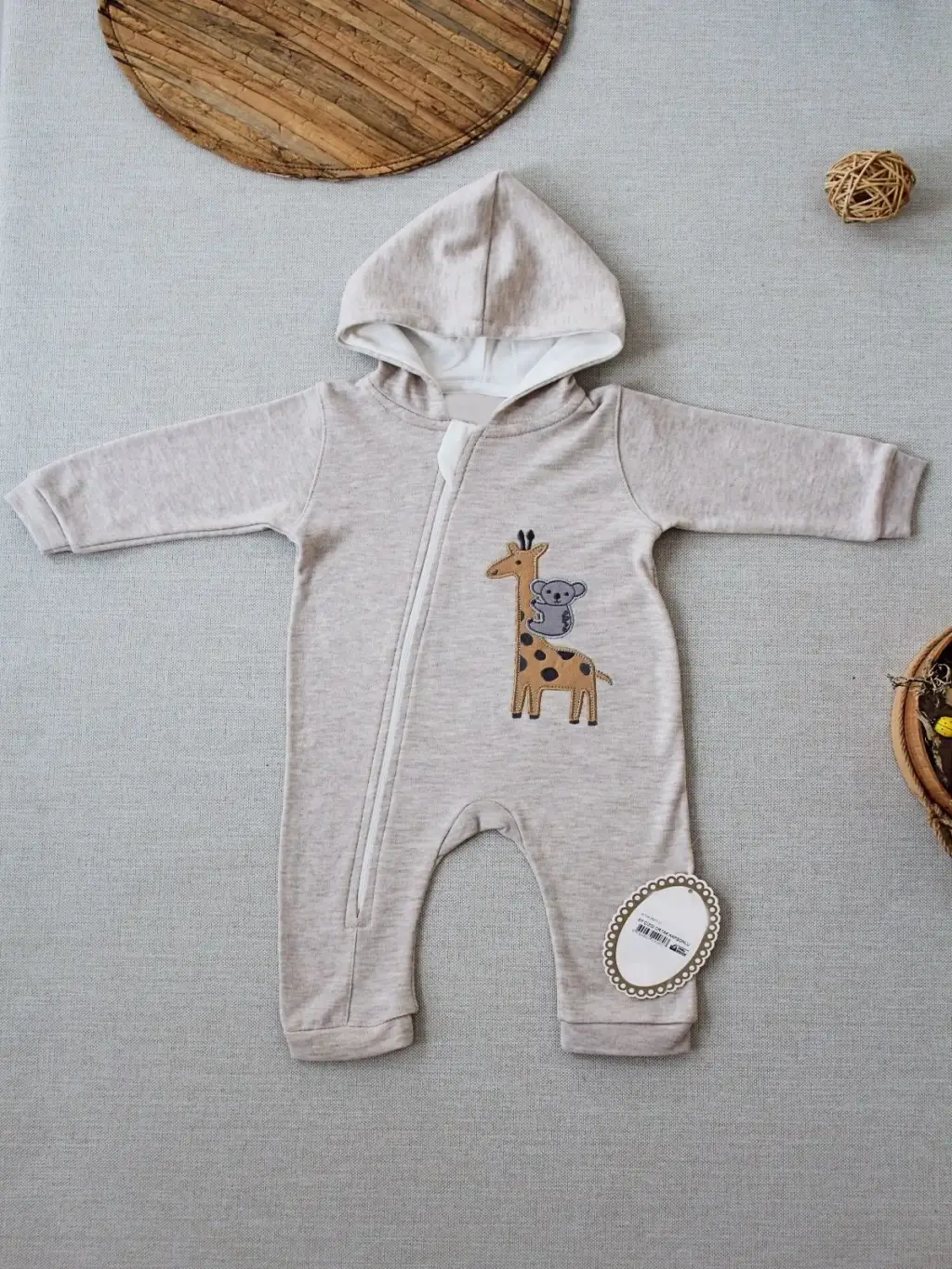 Omarı Zürafa Nakışlı Kapşonlu Bebek Tulumu - Ekru Renkli