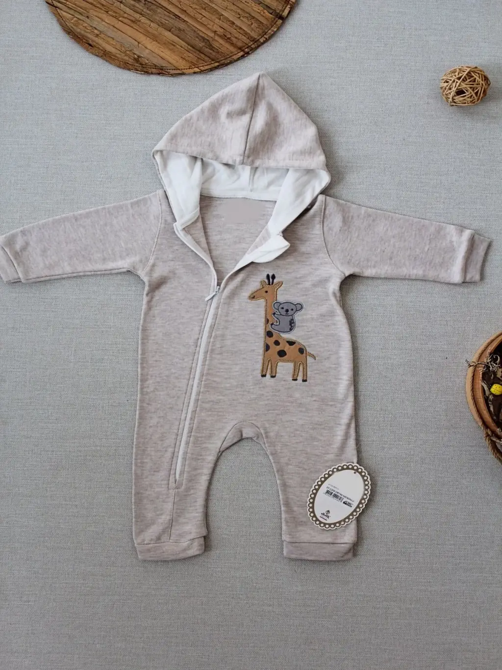 6-9 9-12 Ay Ef Çizgi Boy Fermuarlı Zürafa Nakışlı Kapşonlu Kız Erkek Bebek Tulumu
