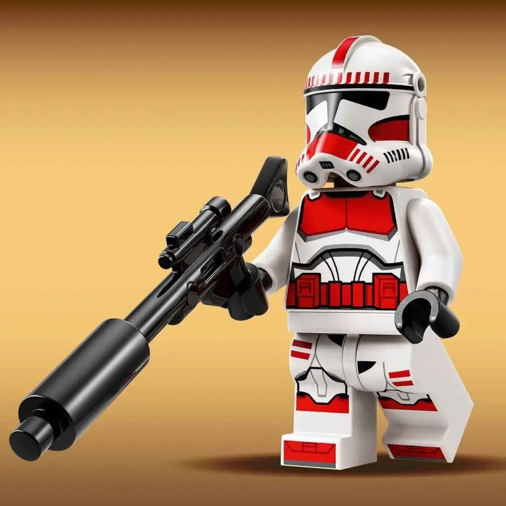 Klon Şok Trooperlara özgü kırmızı ve beyaz renkli zırhıyla bu robot, oyun zamanı görevleri arasında çocukların odalarında sergilenirken de harika görünür.