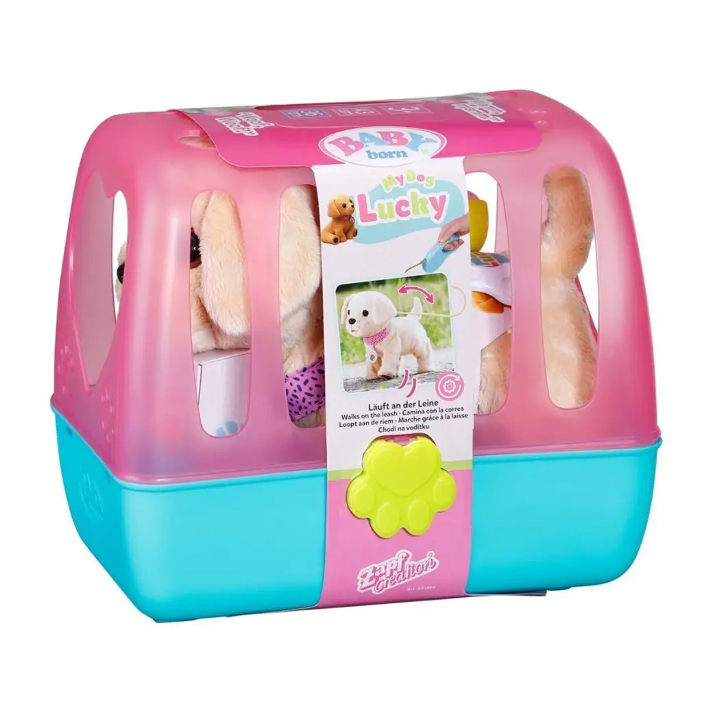 Köpeğim Lucky ile tanış! Baby Born çizgi filminden tanıdığımız Köpeğim Lucky, tasmayla yürüyebiliyor, kokluyor, kuyruğunu sallıyor, kabından gerçek su içiyor ve bacağını kaldırıp tuvaletini yapıyor!