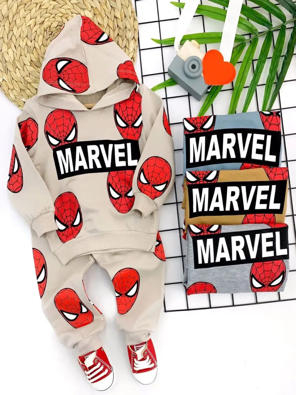 9-12-18-24 Ay Kapşonlu Örümcek Adam Baskılı Uzun Kollu 3lü Kız Erkek Bebek Takımı