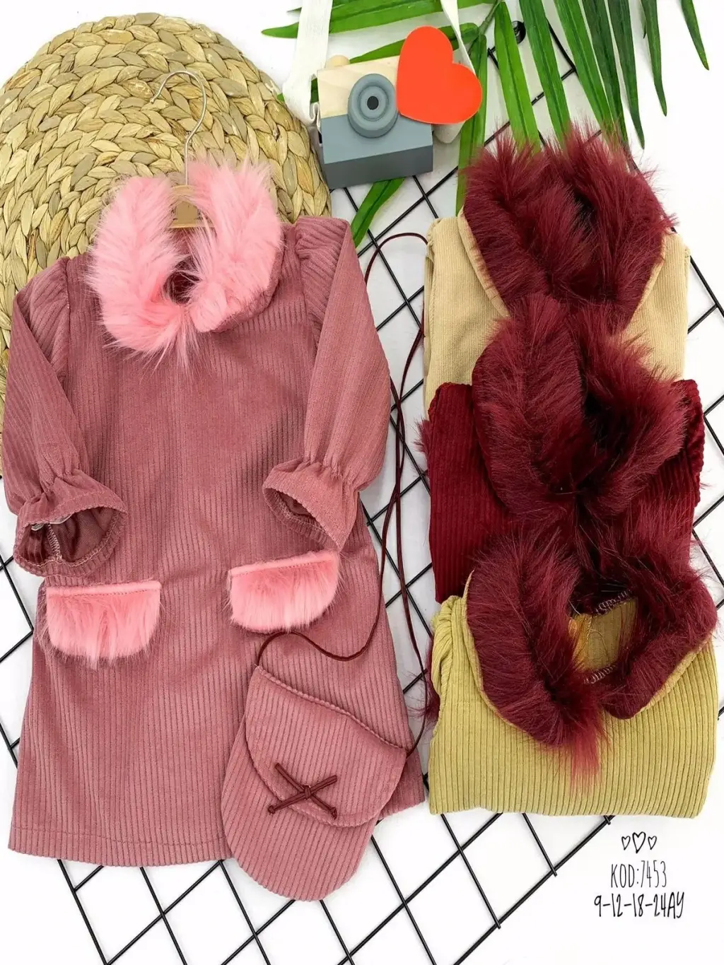 9-12-18-24 Ay Tüylü Yaka Ve Cep Kapaklı Çantalı Fitilli Kadife Uzun Kollu 2li Kız Bebek Elbisesi
