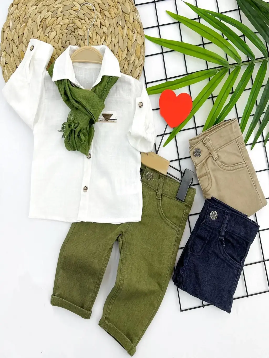 9-12-18-24 Ay Ve 3-4-5 Yaş Fularlı Pamuk Keten Gömlekli Pantolonlu 3lü Erkek Bebek Takımı