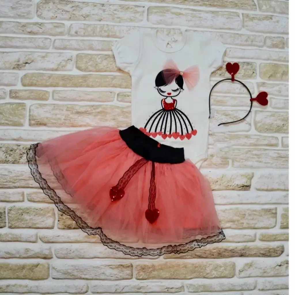 Omarı Sevimli Kalp Nakışlı Tütü Etek 3'lü Kız Bebek Takımı