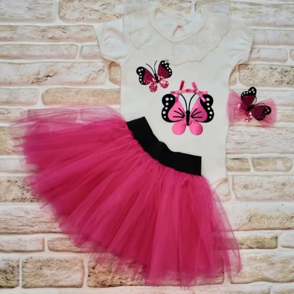 9-12-18 Ay Payetli Kelebek Nakışlı Taçlı Kısa Kollu Tütü Etek 3lü Kız Bebek Takımı