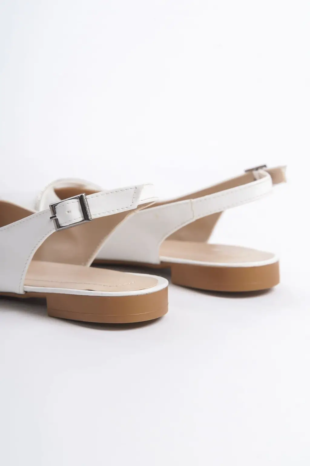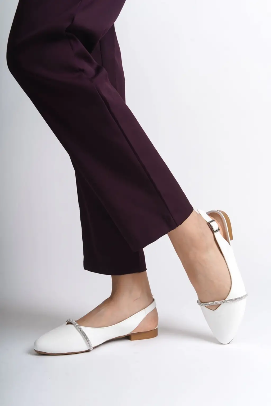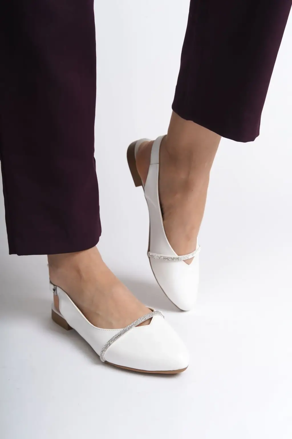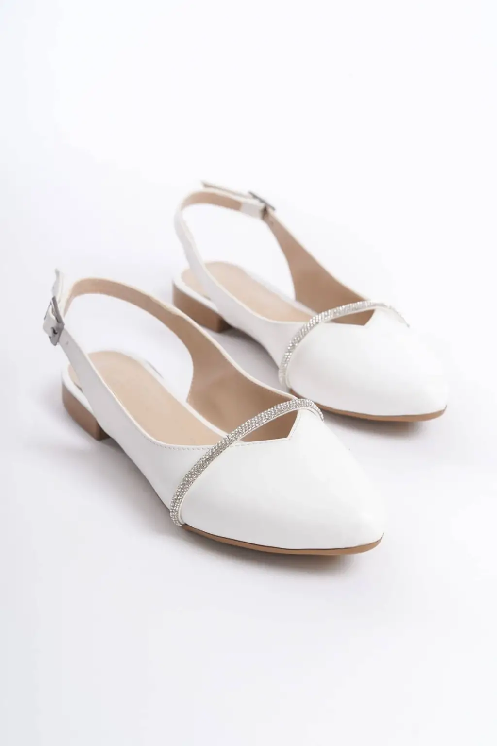 Şık Bayan Babet Ayakkabı Taş Detaylı CKısa Topuk - Beyaz