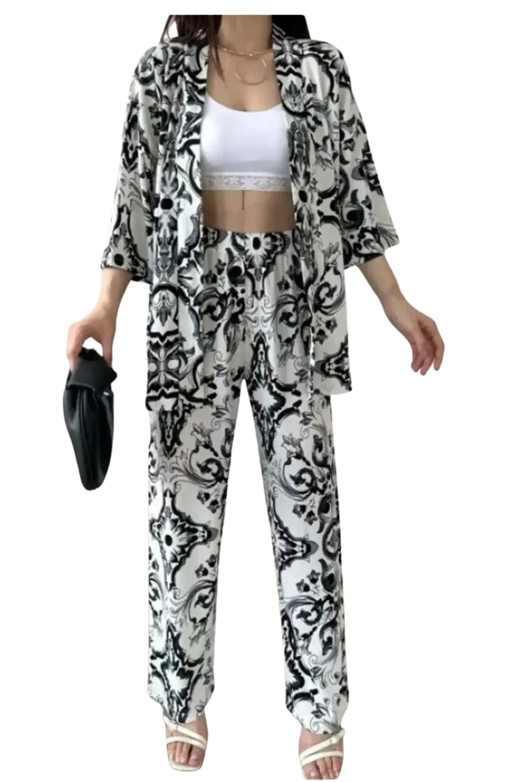 Alt Üst Takım Kimono, plajda, havuz kenarında ya da yazlık mekanlarda rahatlıkla giyilebilecek bir seçenektir. Ayrıca, evde dinlenirken veya gündelik aktivitelerde de şıklığınızı korumanıza yardımcı olur. Üst kısmı açık bir yapıya sahip olduğu için, ister sade bir atletle, ister şık bir bluz ile kombinleyebilirsiniz.