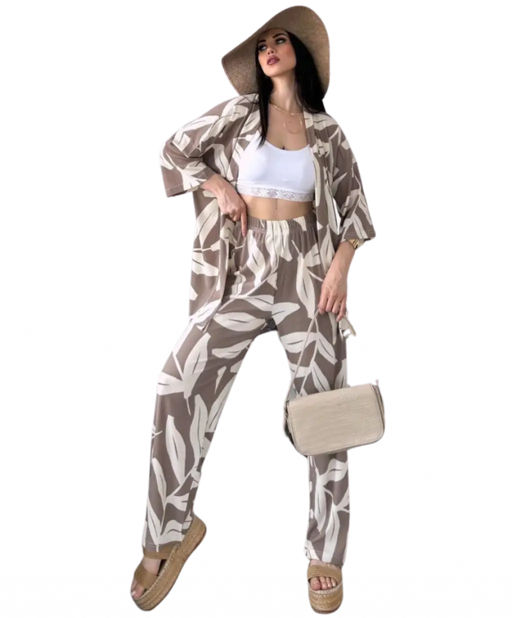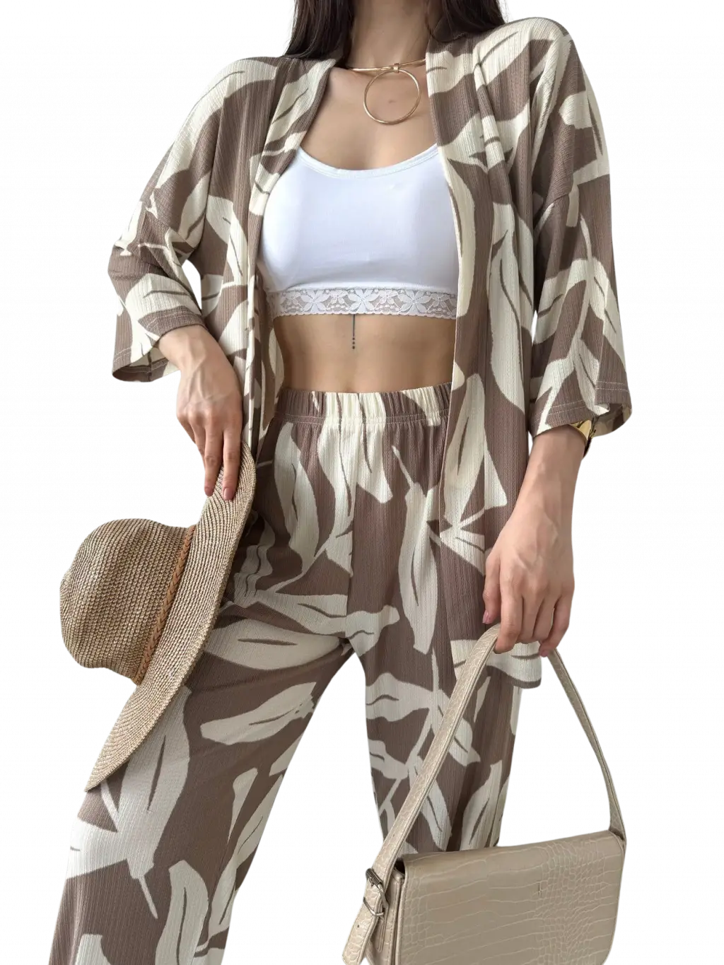 Şıklığın ve rahatlığın mükemmel bir birleşimi olarak tasarlanmış olan Alt Üst Takım Kimono, tarzınıza zarif bir dokunuş katmak için ideal bir parçadır. Desenli kahverengi tasarımı, her türlü kombin ile uyum sağlayarak gardırobunuzun vazgeçilmezlerinden biri olmayı vaat ediyor.