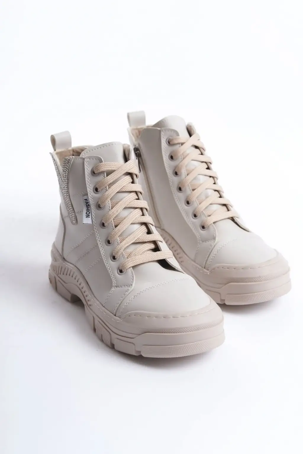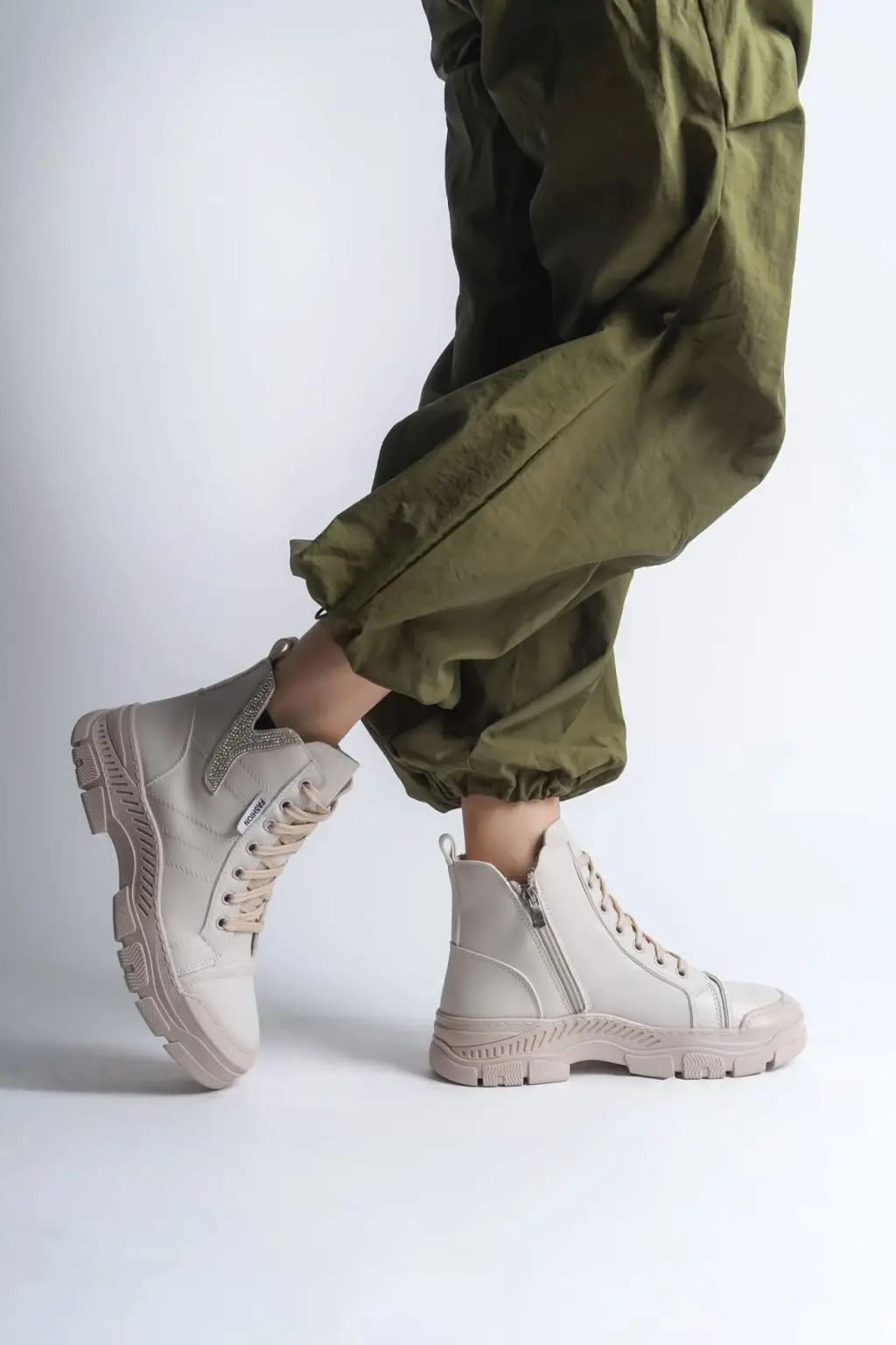 Omarı Rahat ve Şık Tabanlı Bağcıklı Bot - Krem