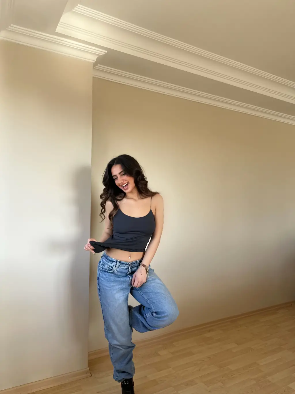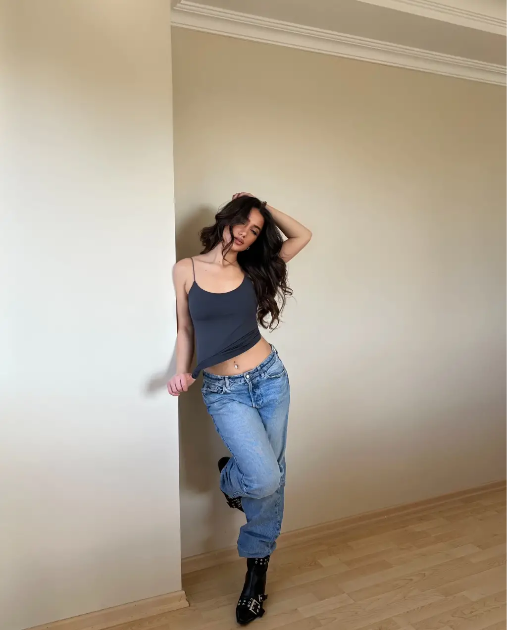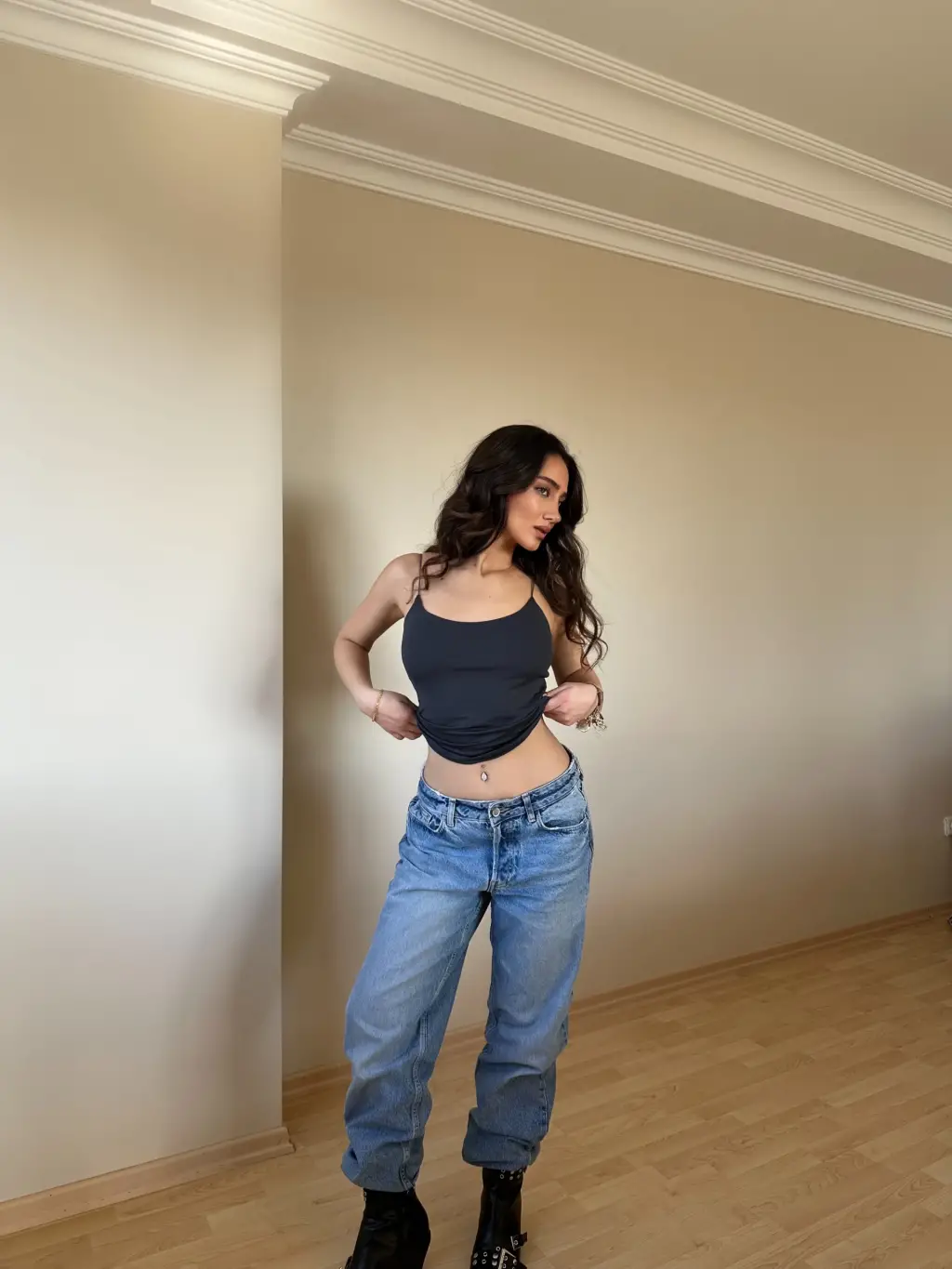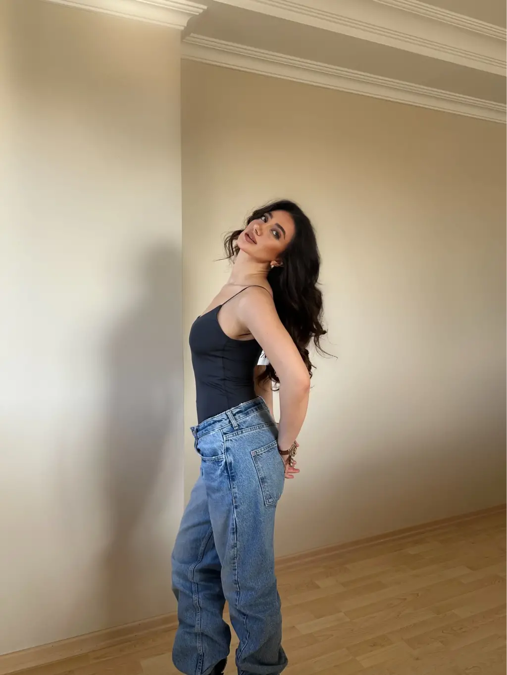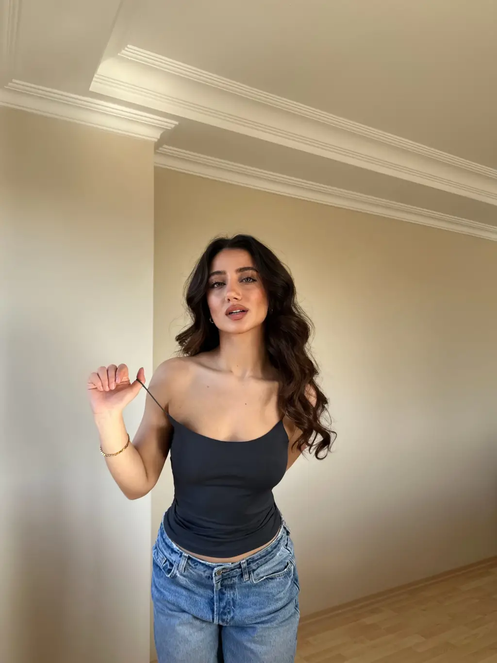 Kadın Ip Askılı Geniş V Yakalı Deri Bluz