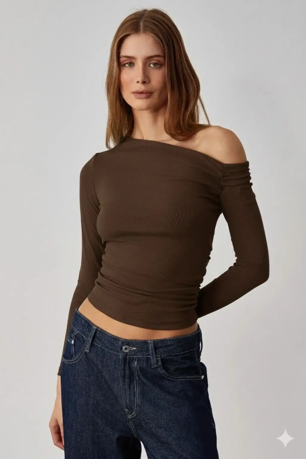 Bu kahverengi asimetrik yaka bluz, şıklığı ve rahatlığı bir arada sunuyor. Hem günlük kullanıma hem de özel günlerde tercih edebileceğiniz şık bir parça.
