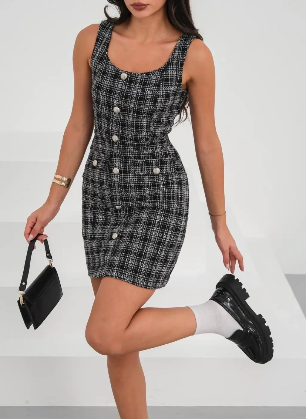 Askılı CH kumaş düğmeli elbise siyahbeyaz h265007, şıklığı ve rahatlığı bir arada sunar.