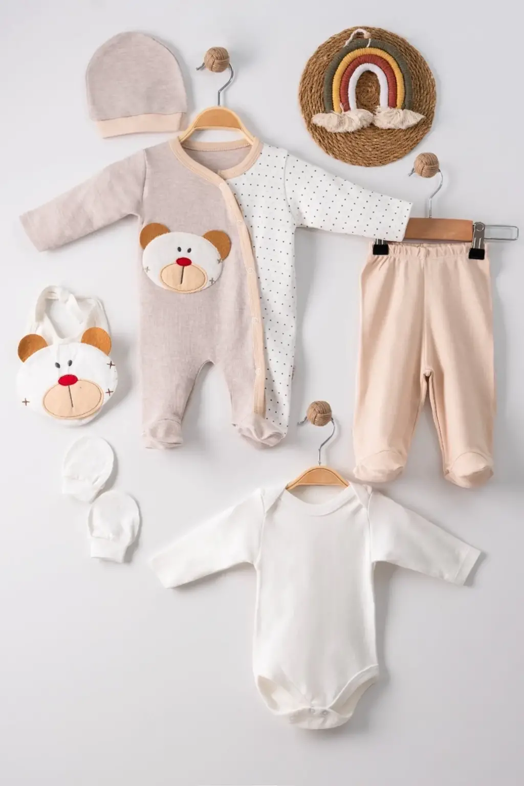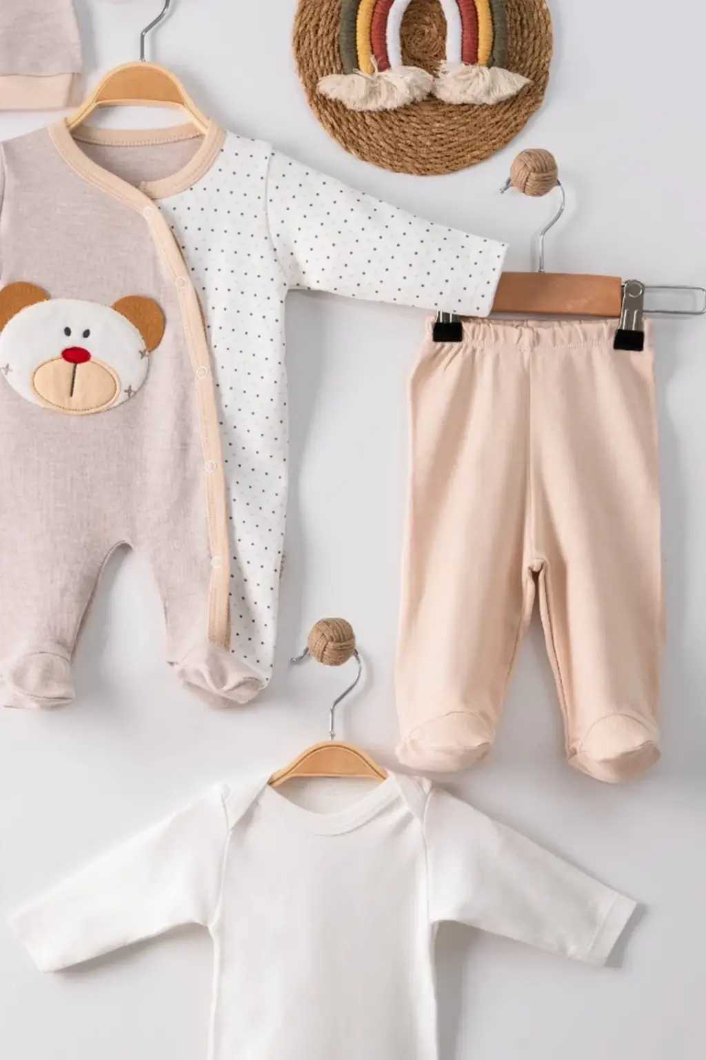 Ayıcık Nakışlı Tulumlu % 100 Pamuk Erkek Bebek 5'li Set