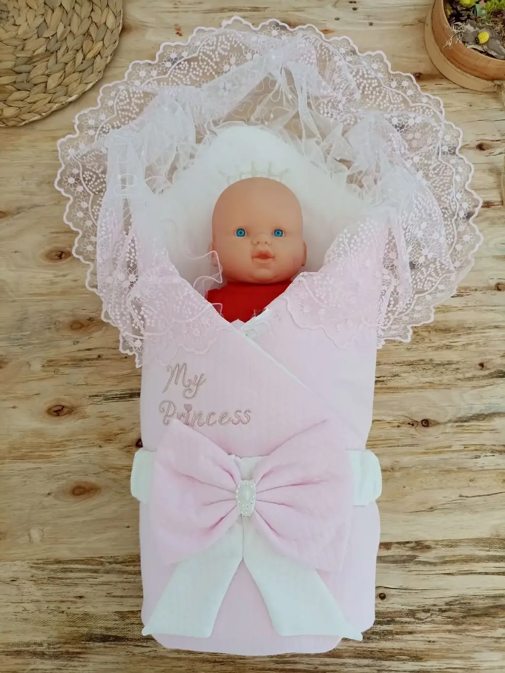 Bal Peteği My Princess Taç Nakış İnci Fiyonklu Dantel Duvaklı Delüks Kundak Bebek Battaniyesi