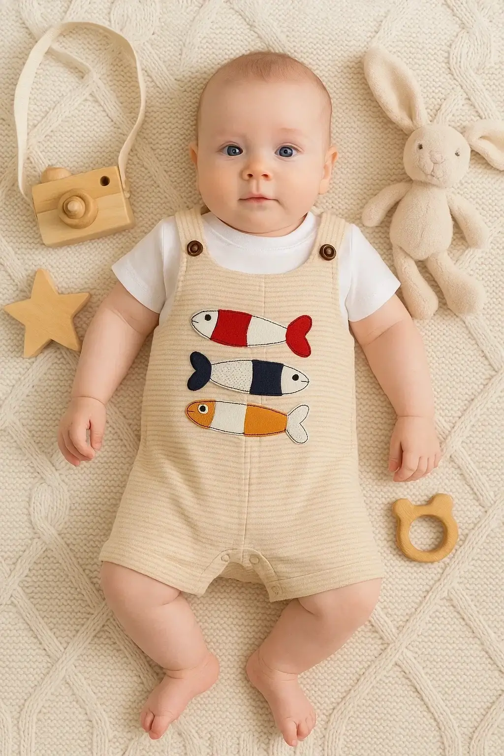 Balık Nakışlı Kısa Kollu Erkek Bebek Tulumu