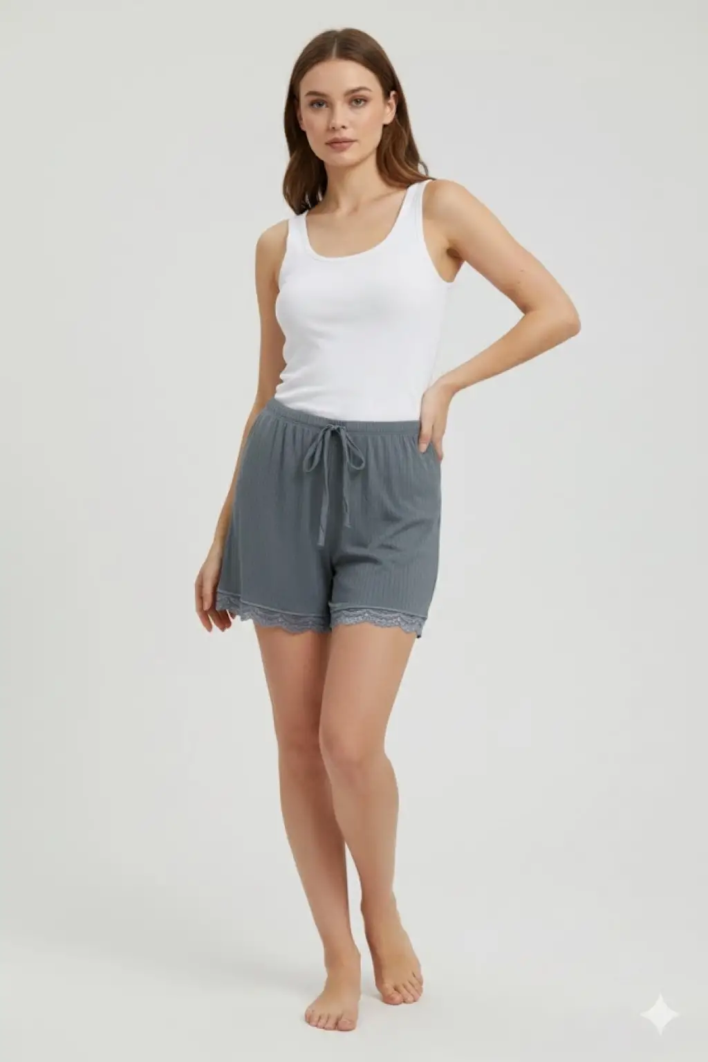 Bambu Fitilli Kadın Ev Şortu Bacak Dantel Detaylı Ev Giyim Gri