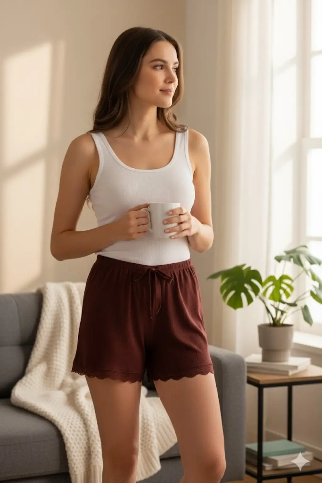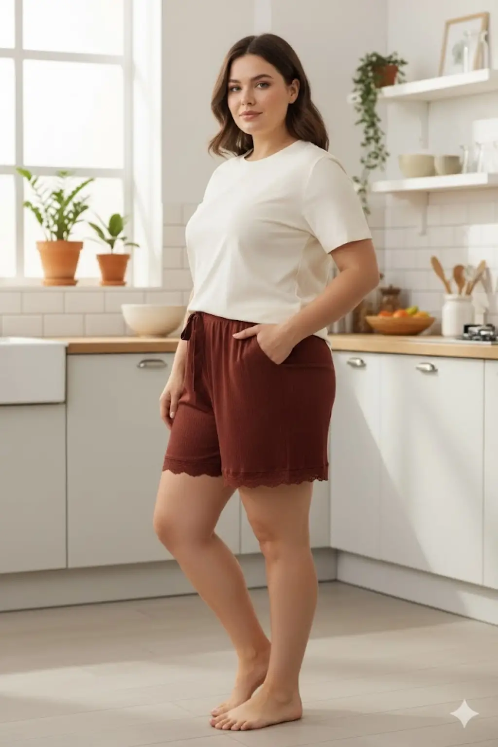 Bambu Fitilli Kadın Ev Şortu Bacak Dantel Detaylı Ev Giyim Koyu Taba