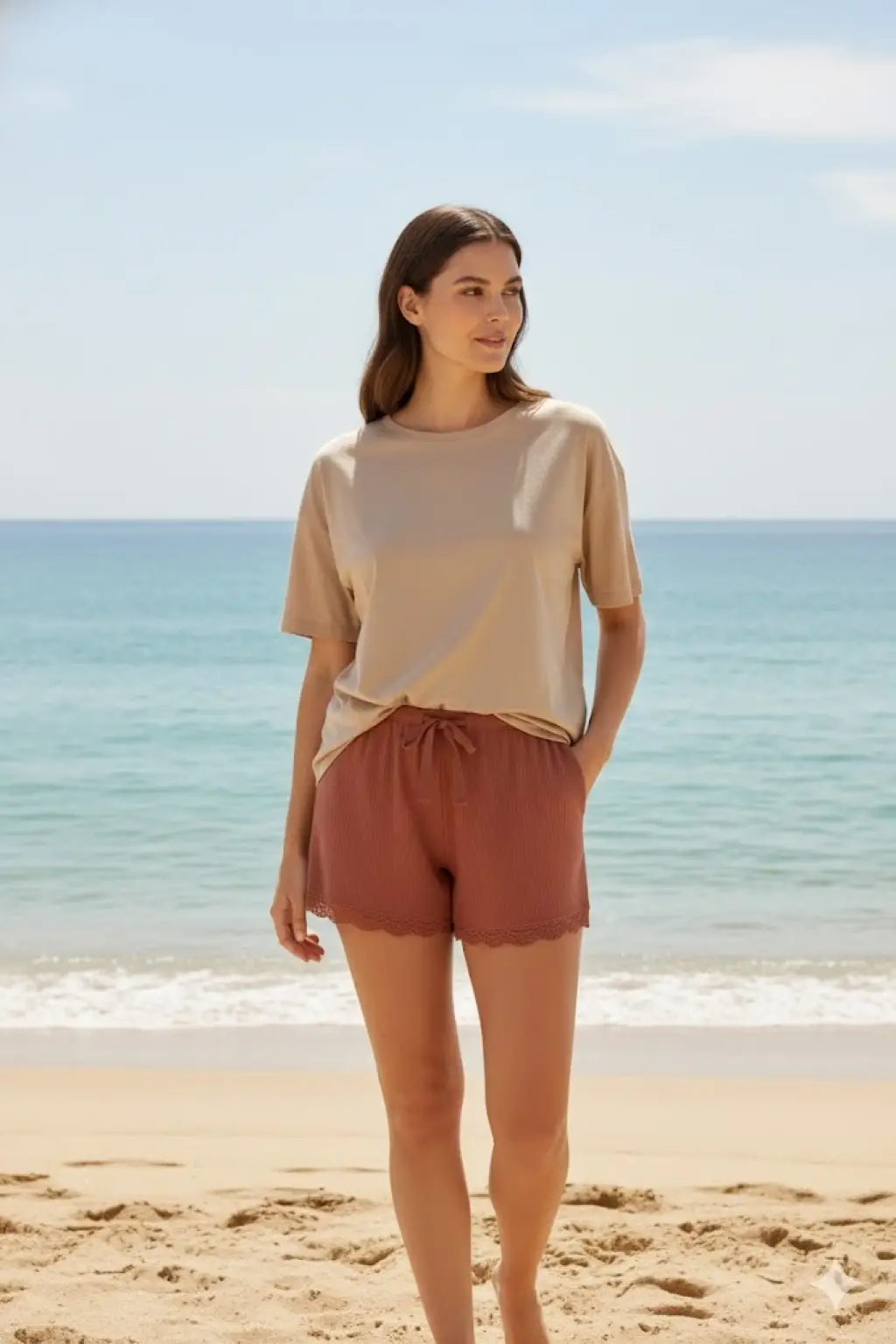 Müslin kumaş şort bağcıklı bej pt