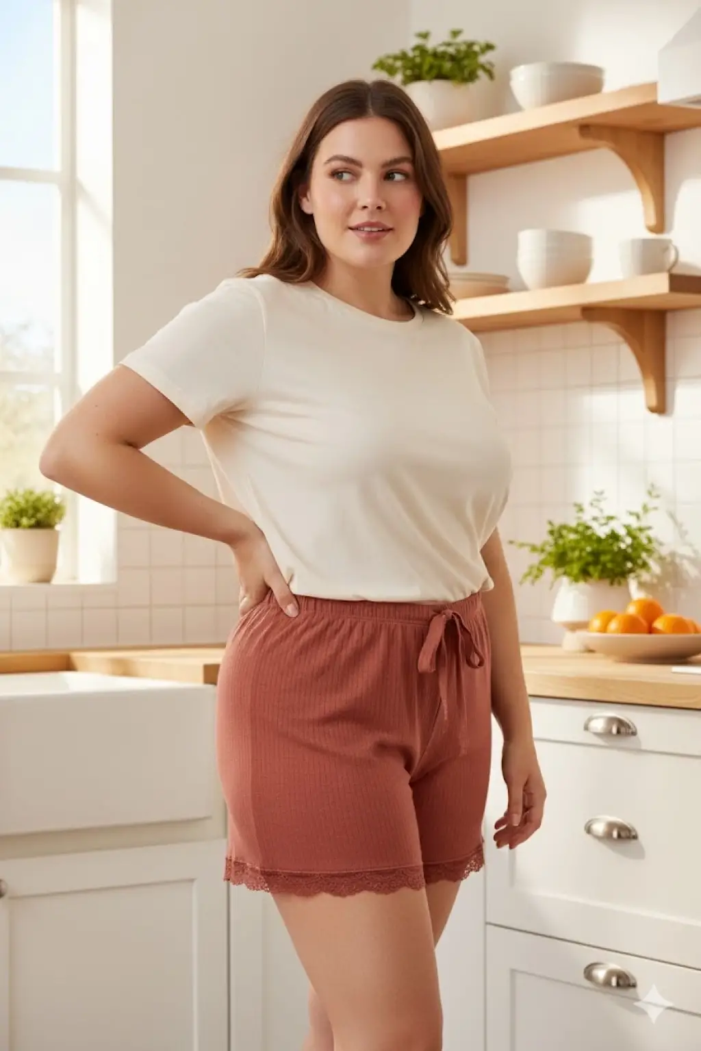 Bambu Fitilli Kadın Ev Şortu Bacak Dantel Detaylı Ev Giyim Taba