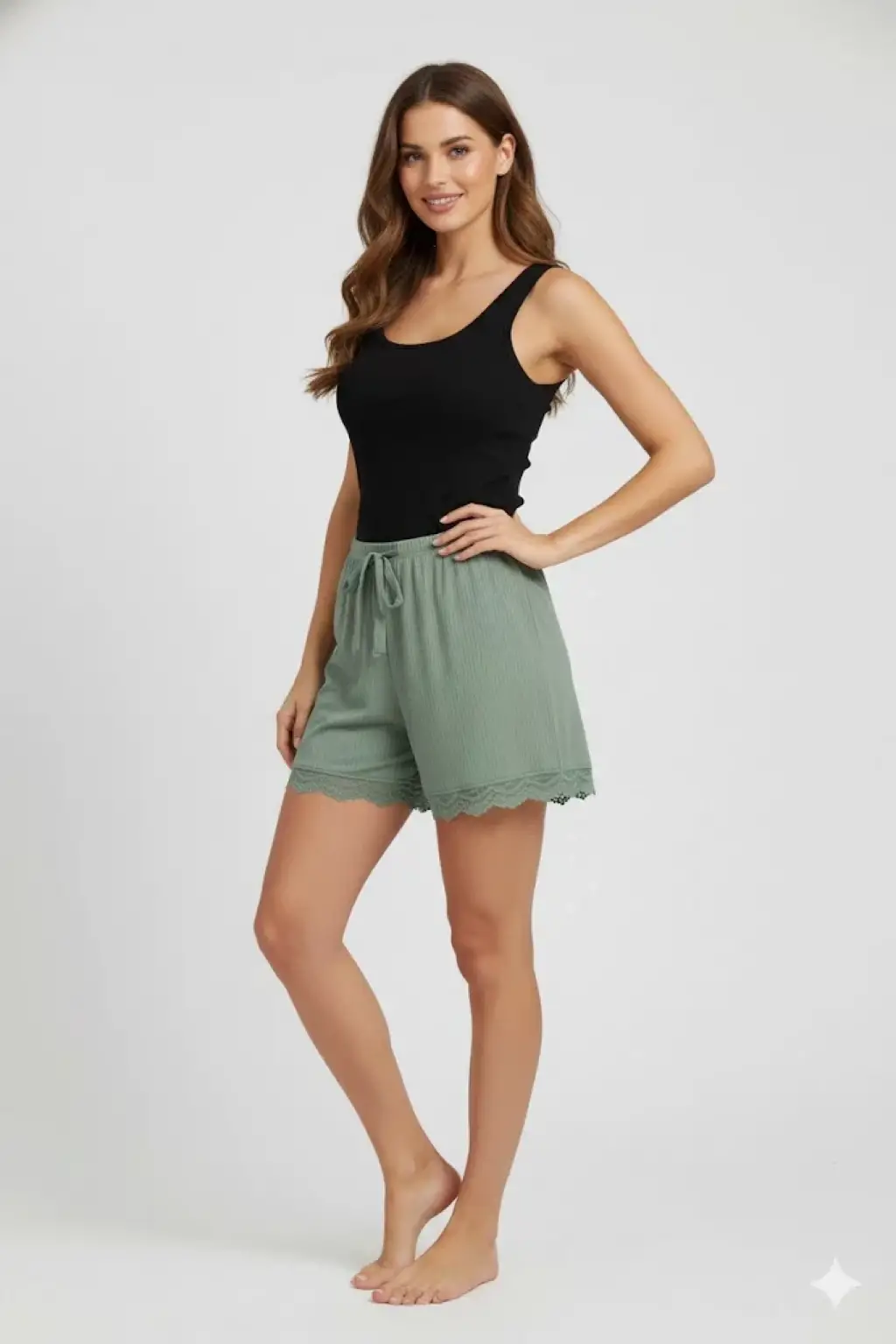 Bambu Fitilli Kadın Ev Şortu Bacak Dantel Detaylı Ev Giyim Yeşil
