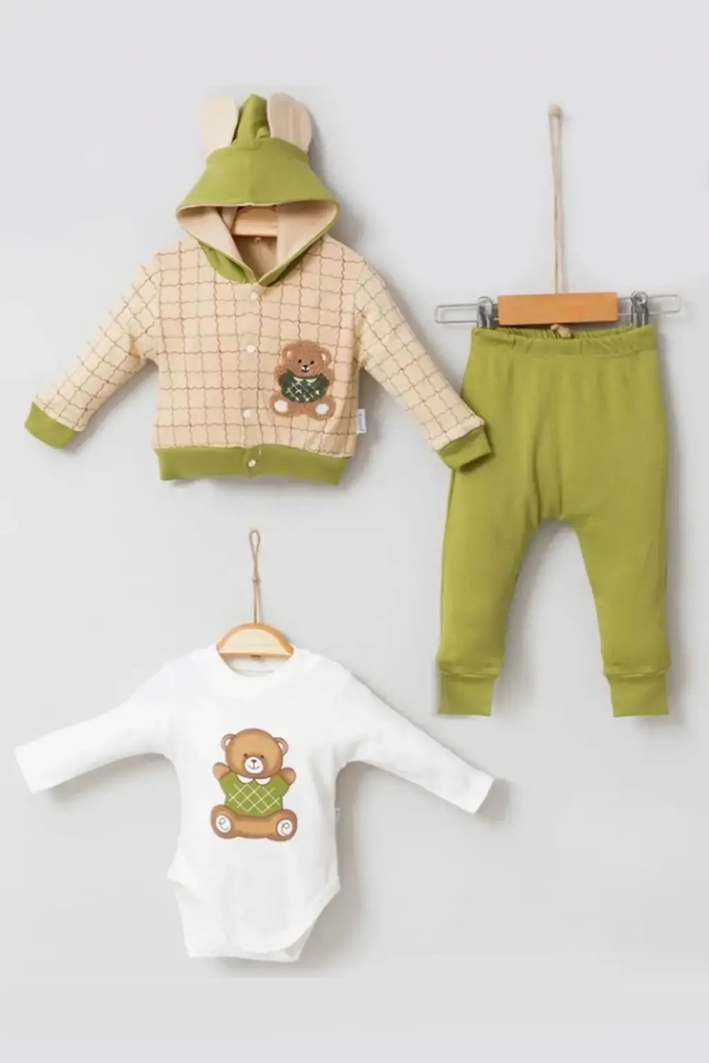 Bear Çizgili % 100 Pamuk Hırkalı 3'lü Bebek Takımı