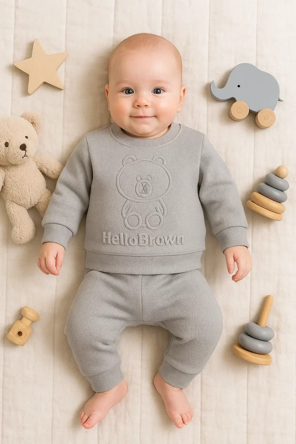 Bear Gofre Kabartmalı 2'li Erkek Bebek Takımı