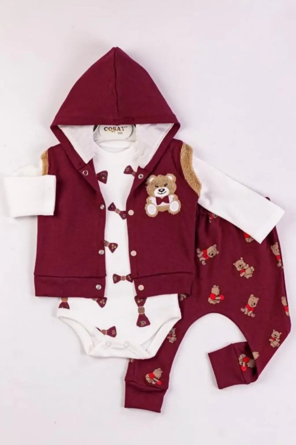 Bear Nakışlı Yelekli 3'lü Erkek Bebek Takımı