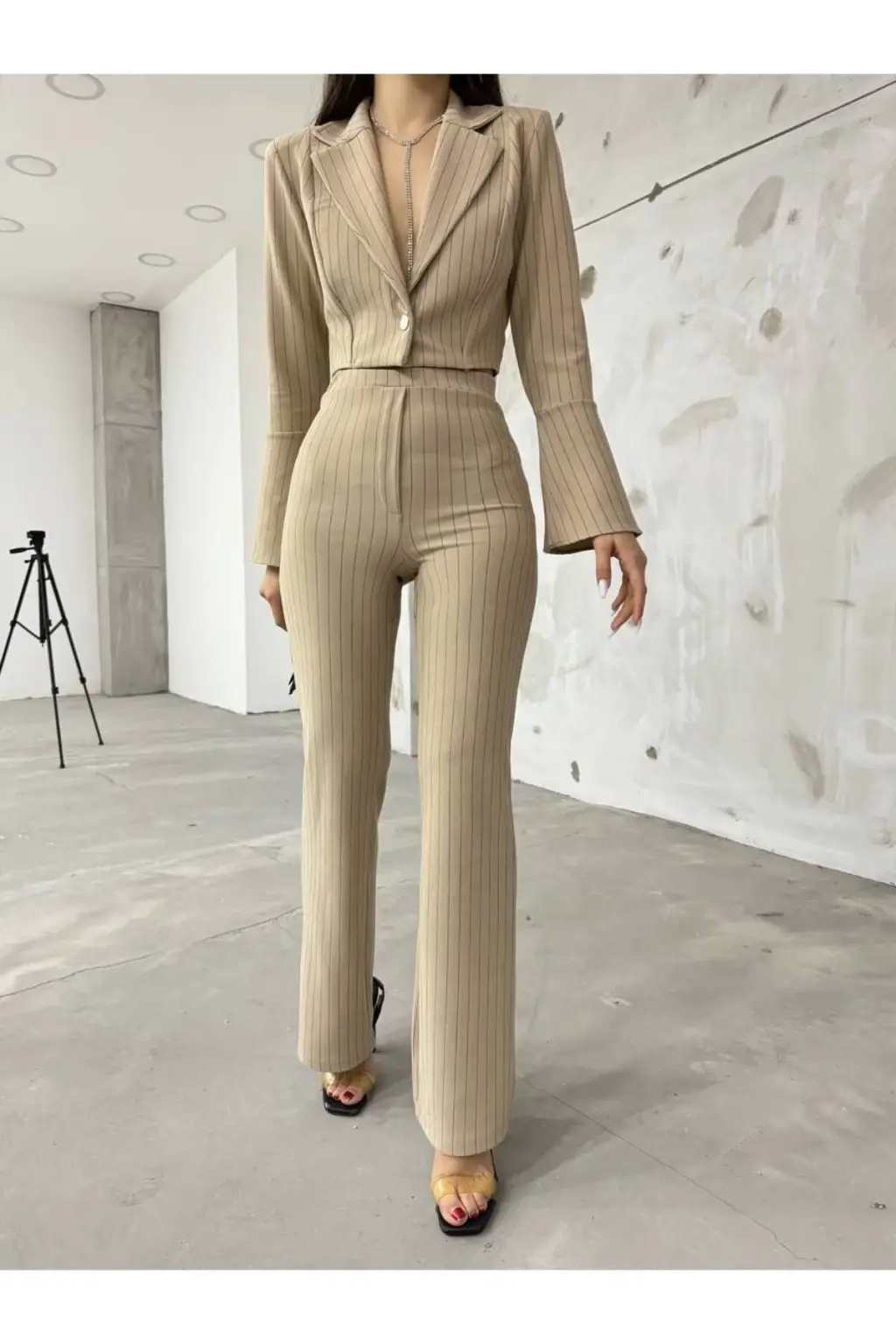 Bej İspanyol Kollu İtalyan Çizgili Takım