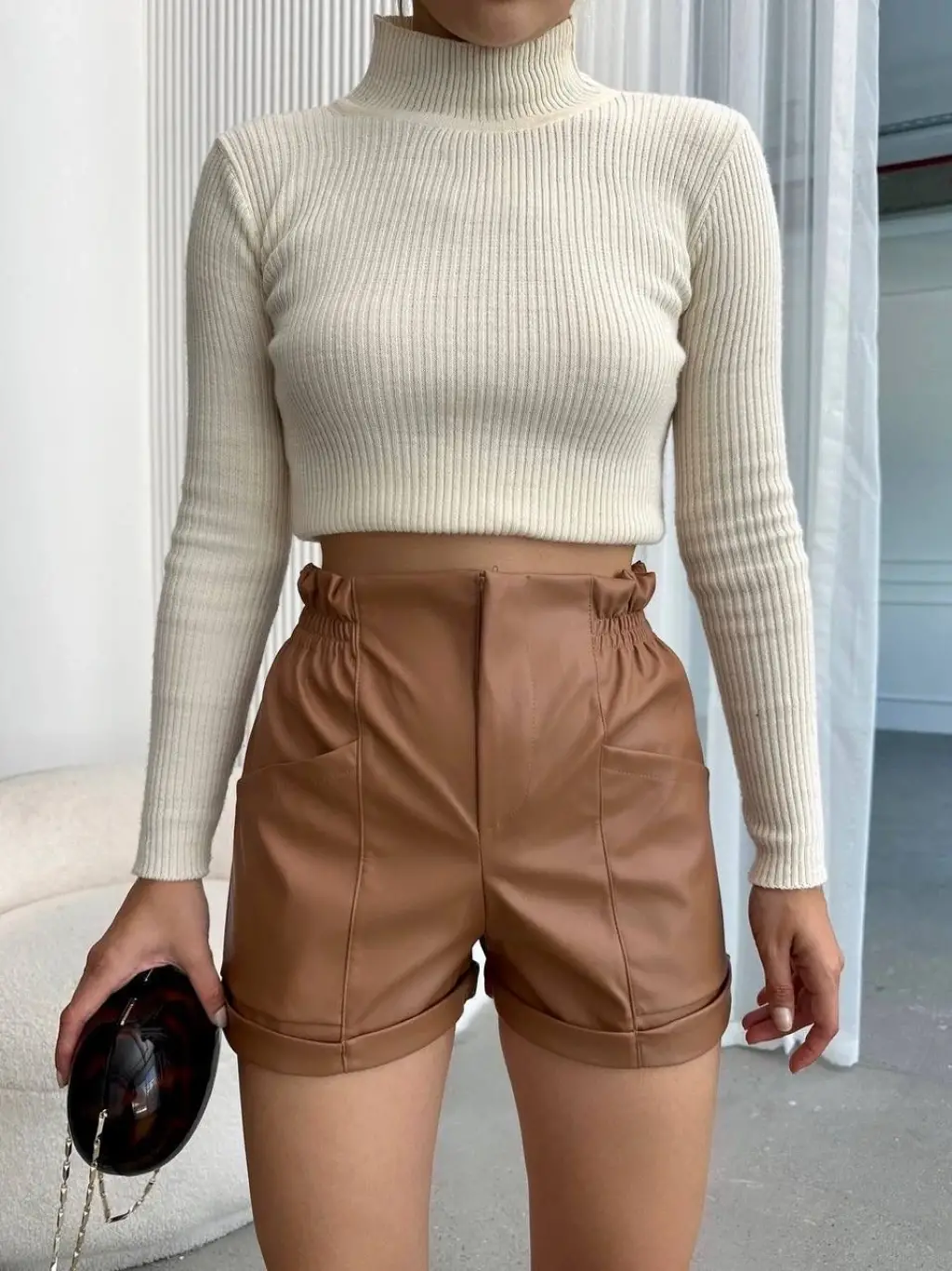 Şıklık ve rahatlık arayan kadınlar için ideal bir seçenek olan Beli Lastikli Deri Şort Kahve H24605, gardırobunuzun vazgeçilmez parçalarından biri olmaya aday!