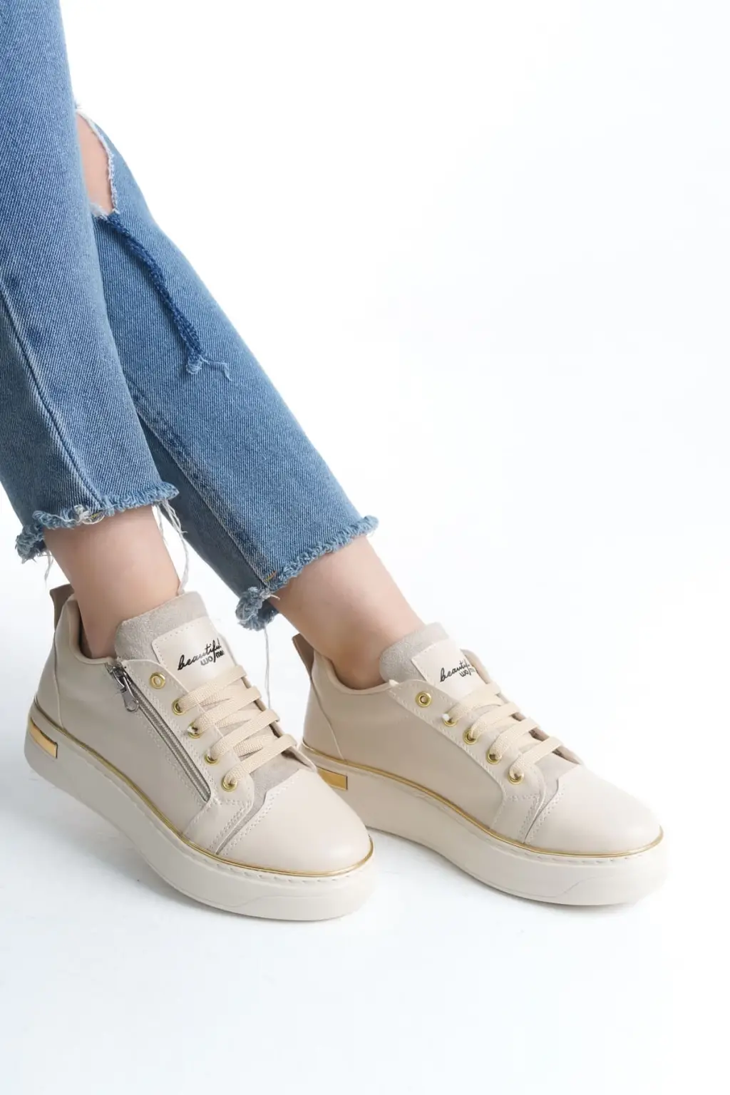 Omarı Fermuarlı Rahat Tabanlı Kadın Spor Ayakkabı Krem/Altın