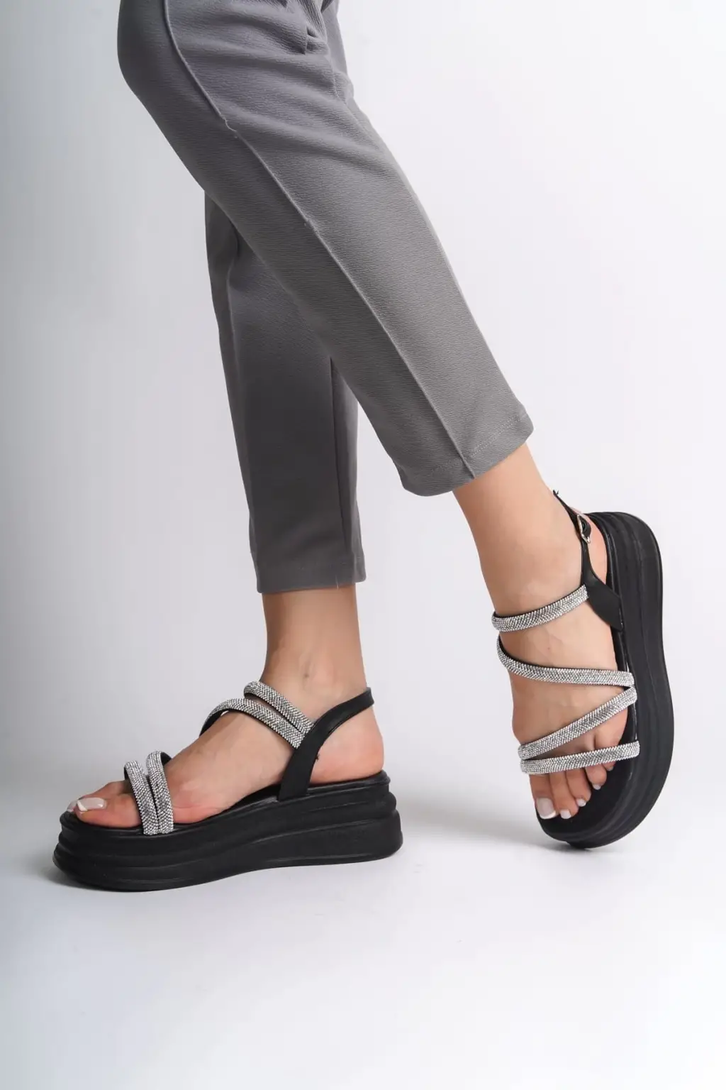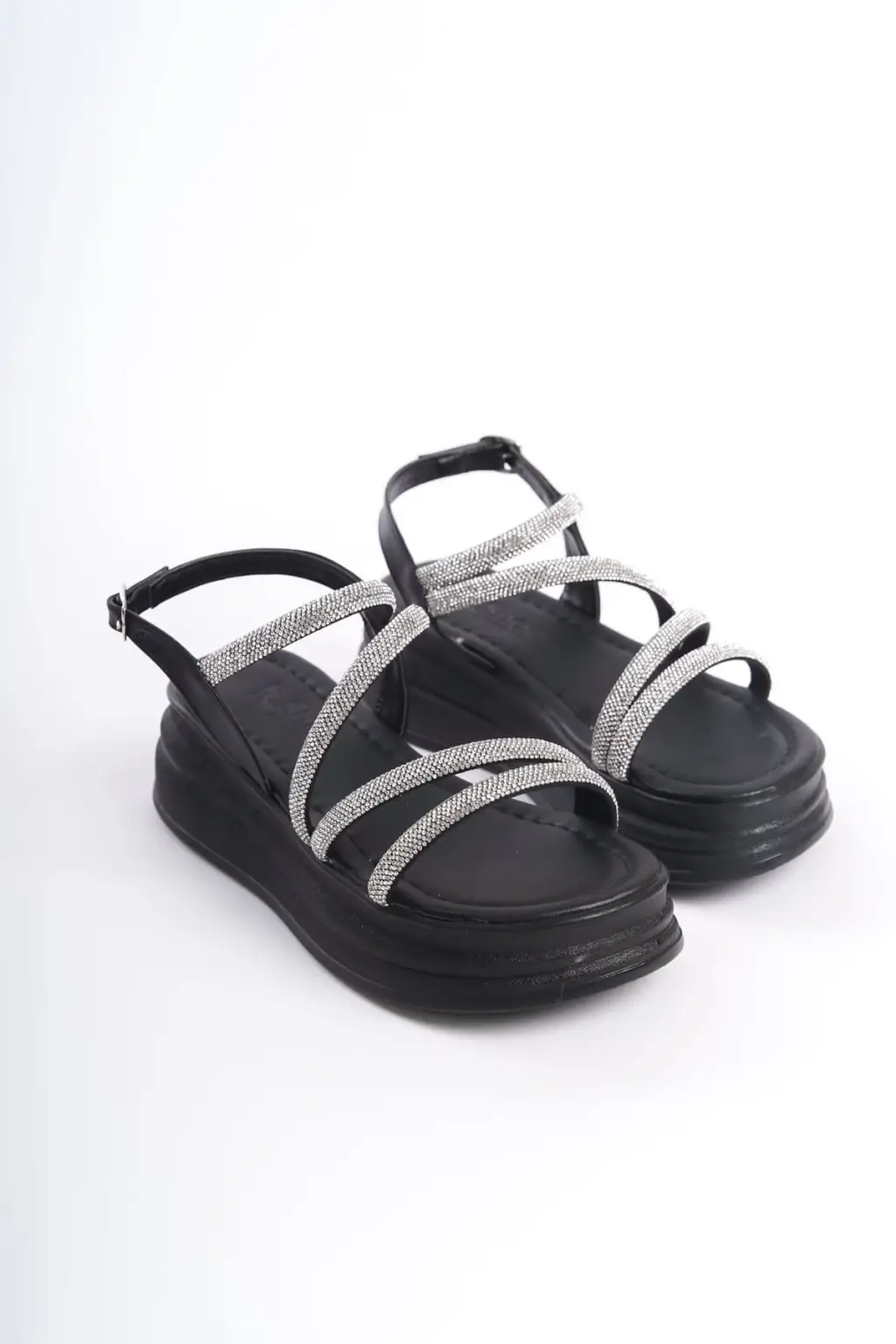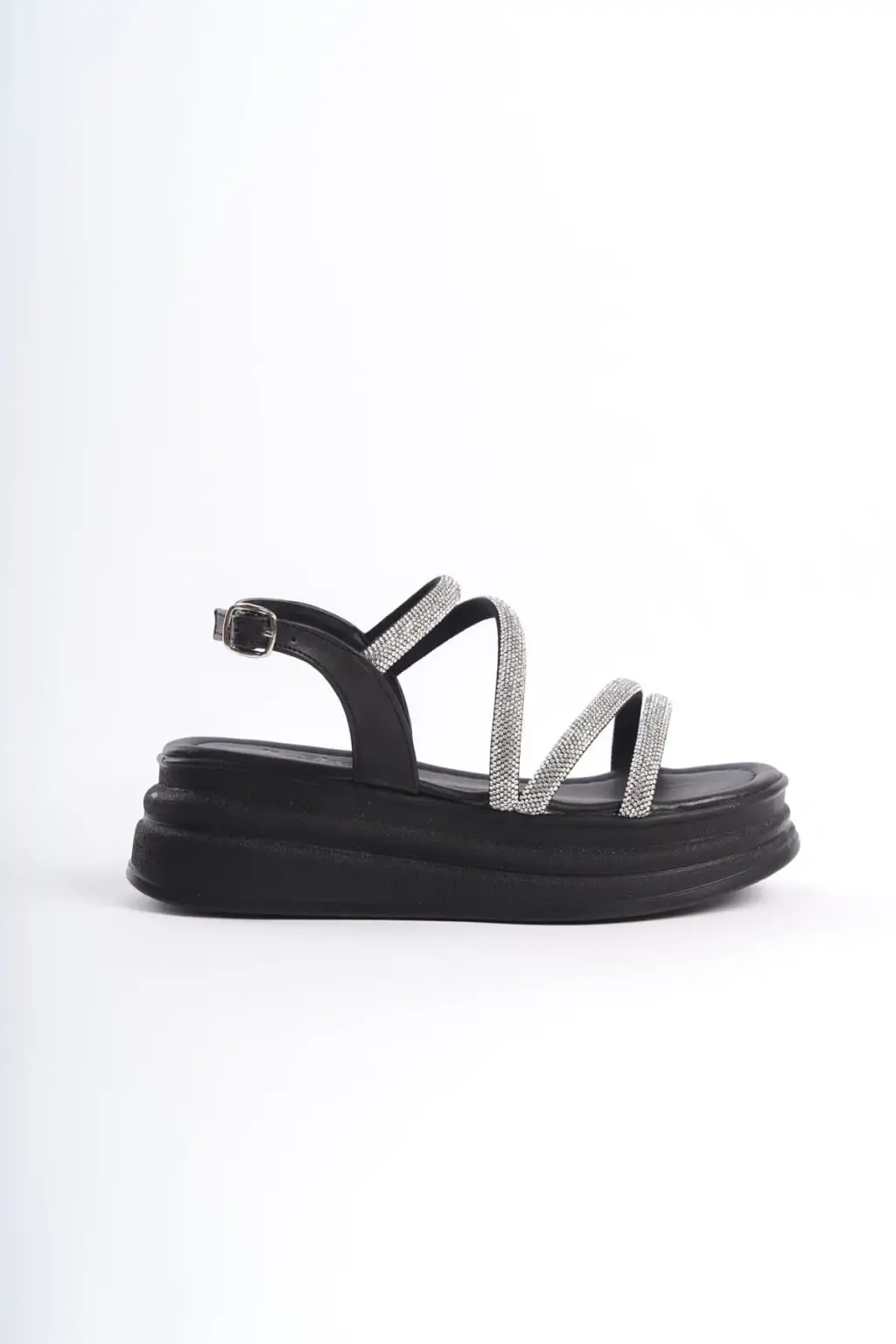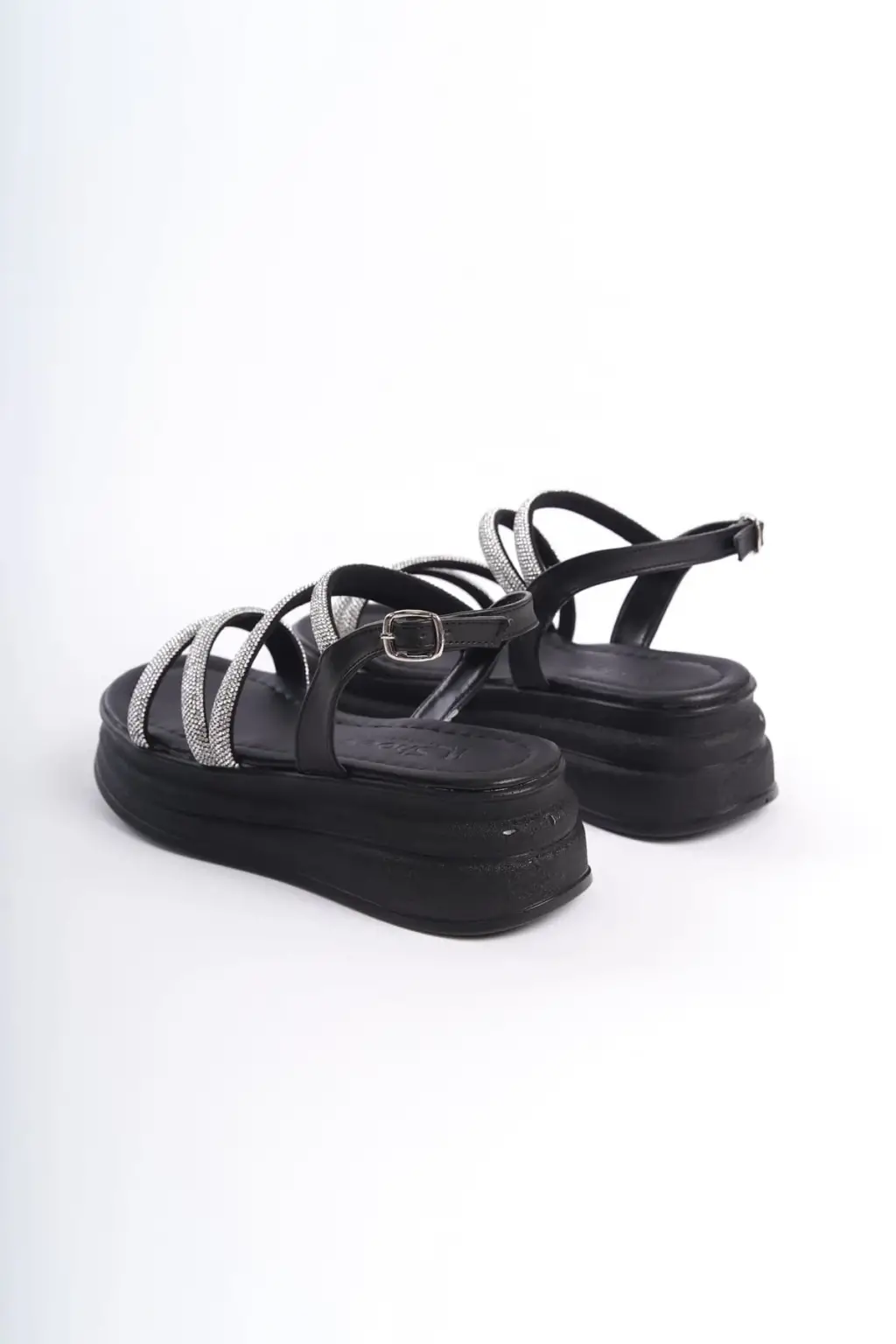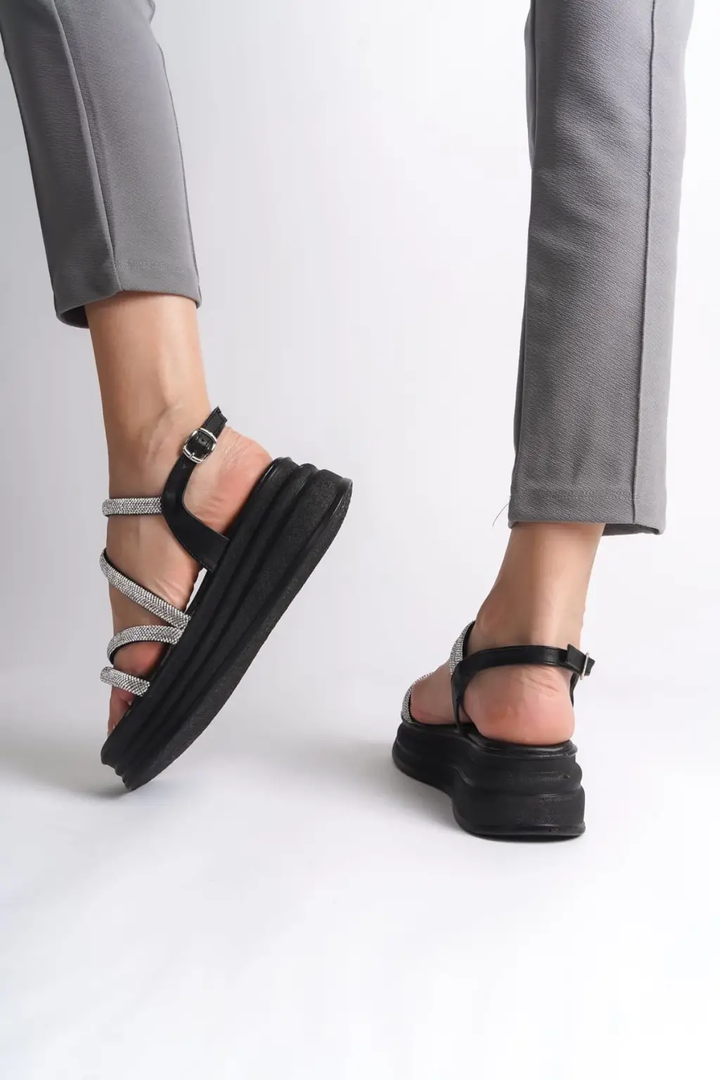 Omarı Kadın Rahat Tabanlı Taşlı Şeritli Sandalet - Siyah