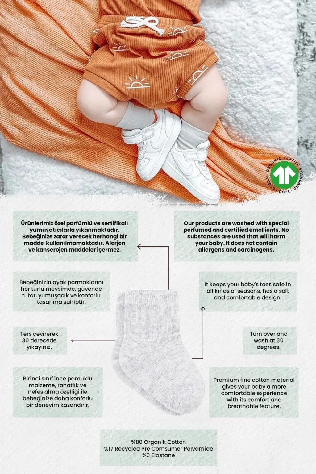 Yumuşak, nefes alabilir, nem emici ve kokulu Bistil çoraplarımız minik bebekleriniz için özenle üretilmiştir.