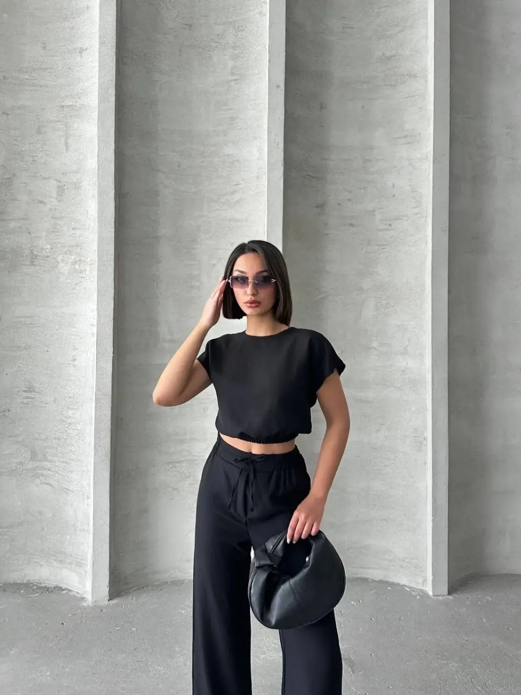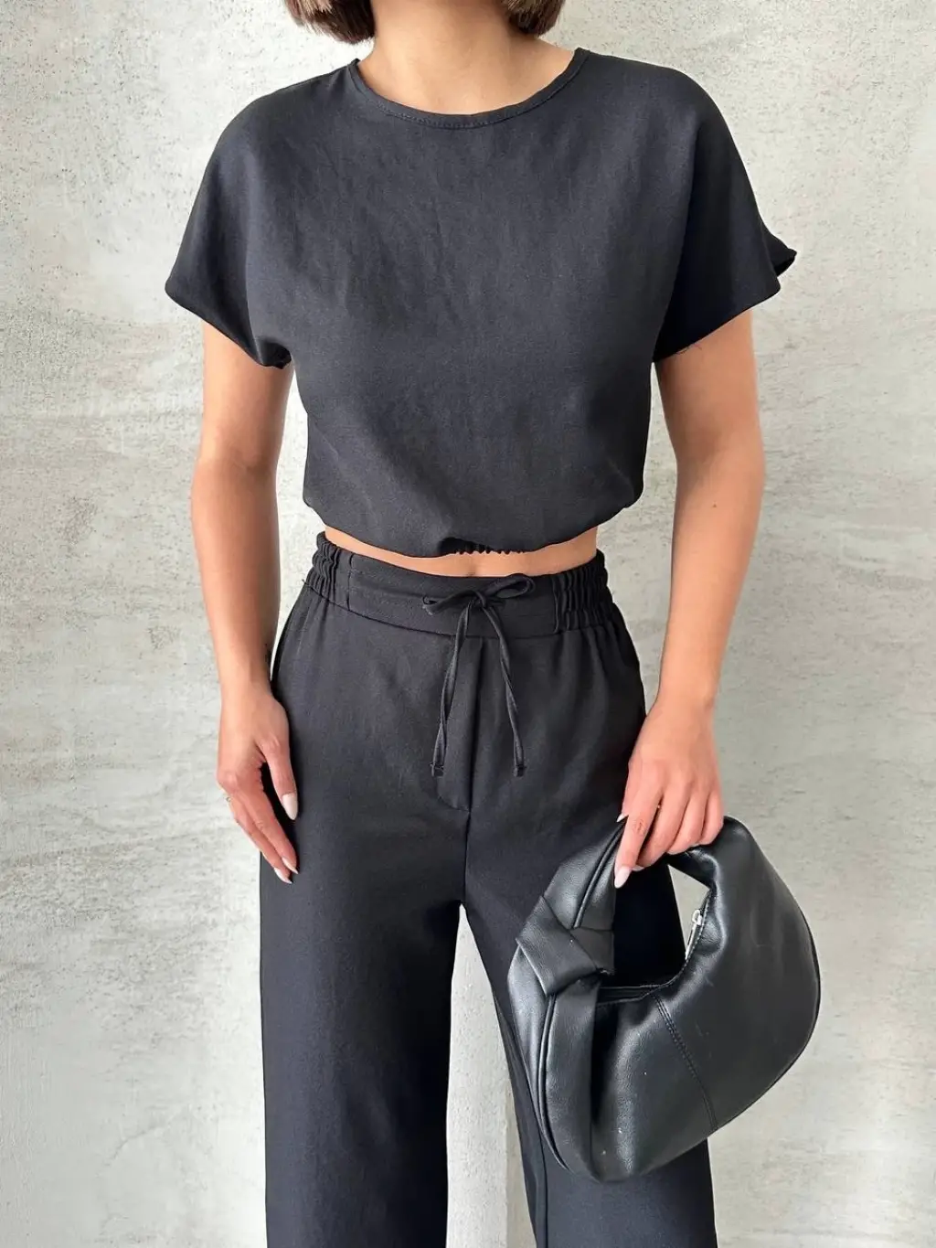 • Bluzunun düz kesimi ve pantolonunun yüksek bel tasarımı ile trend bir stil sunar.
