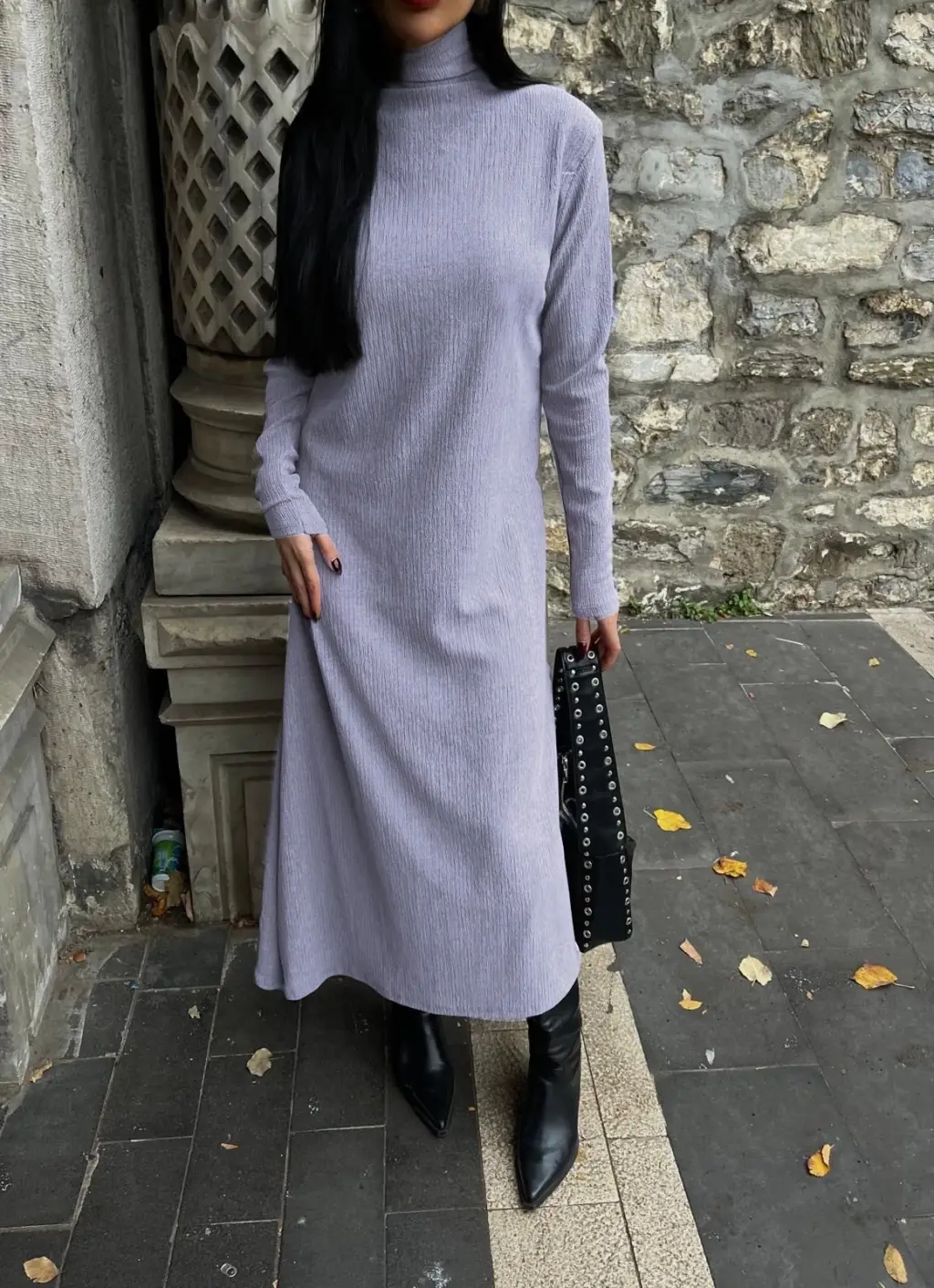Boğazlı kalın bürümcük uzun elbise gri, hem şık hem de rahat bir seçenektir.