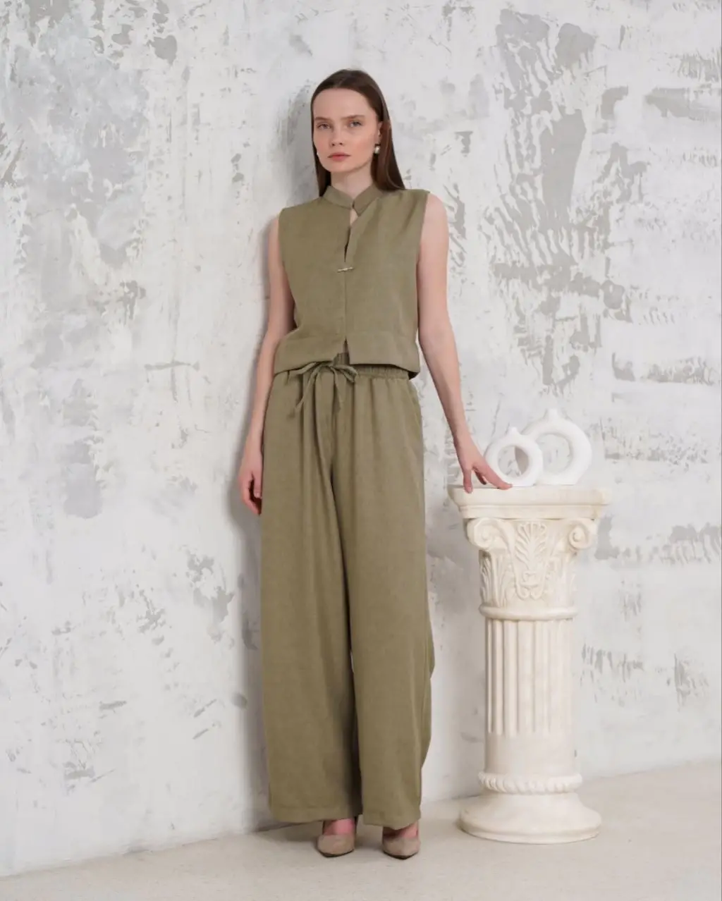 Broşlu yelek pantolon takım haki s255821