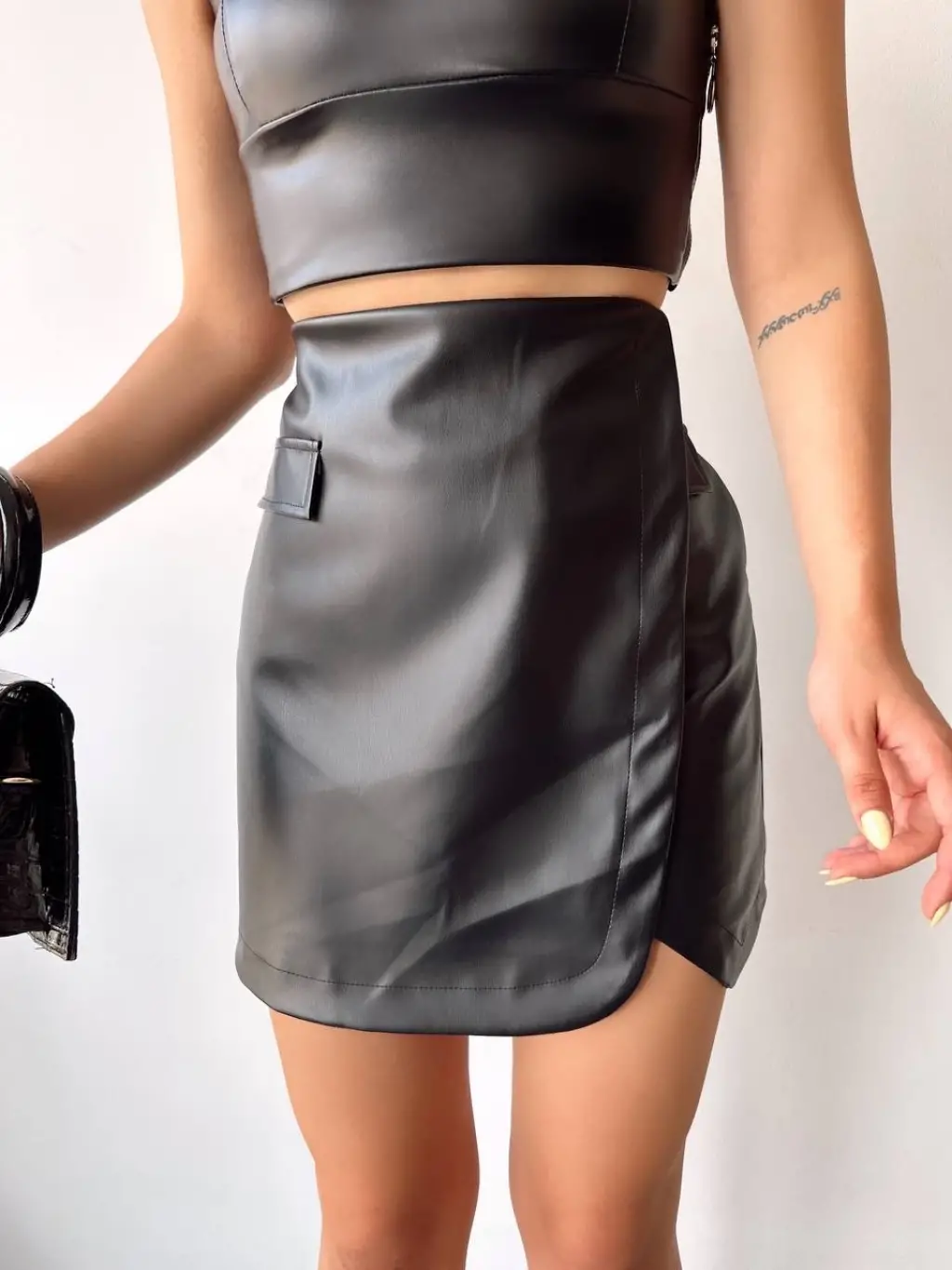 Şıklık ve zarafetin buluştuğu Cep Detaylı Oval Kapaklı Deri Etek Siyah, gardırobunuzun vazgeçilmezi olmaya aday!