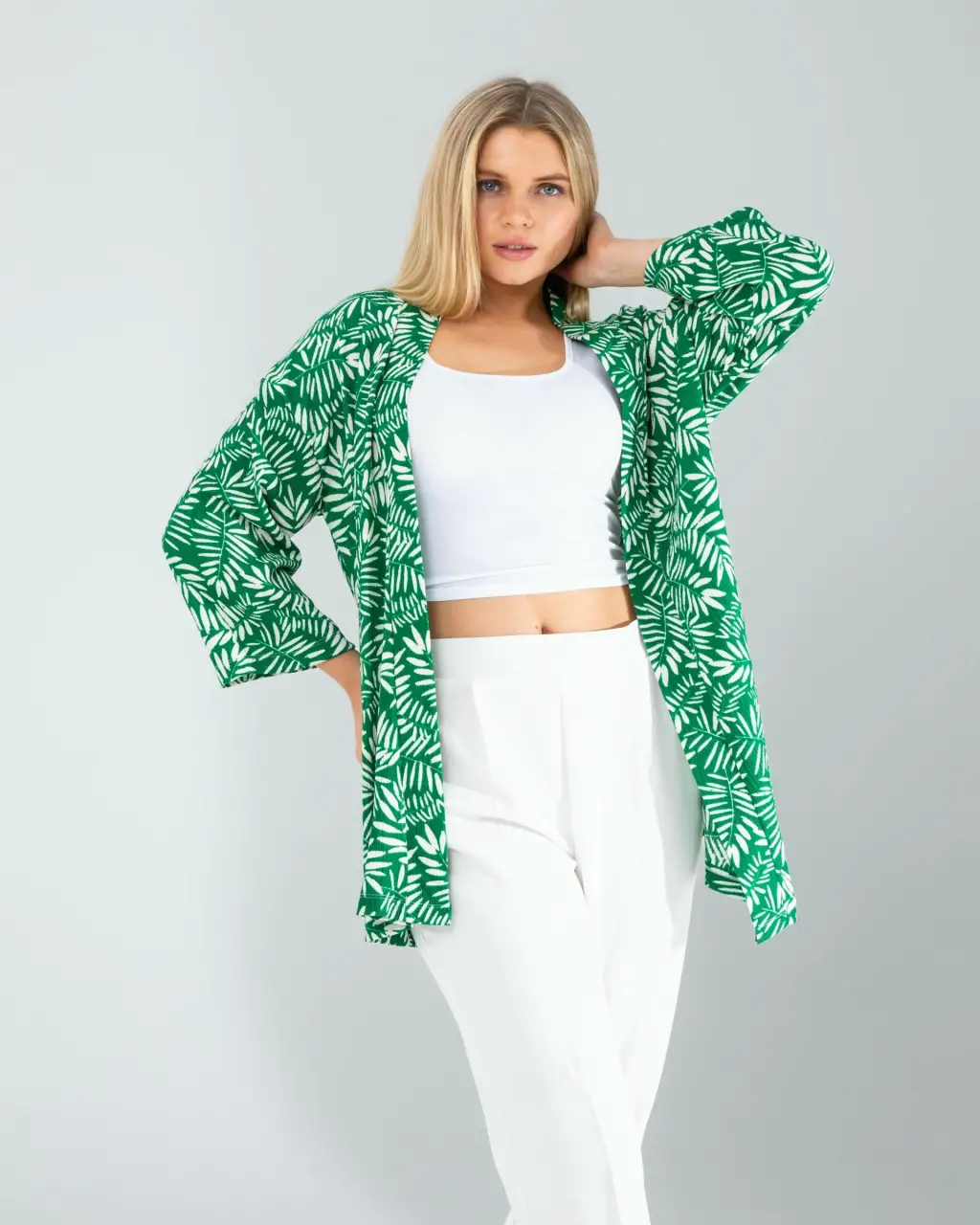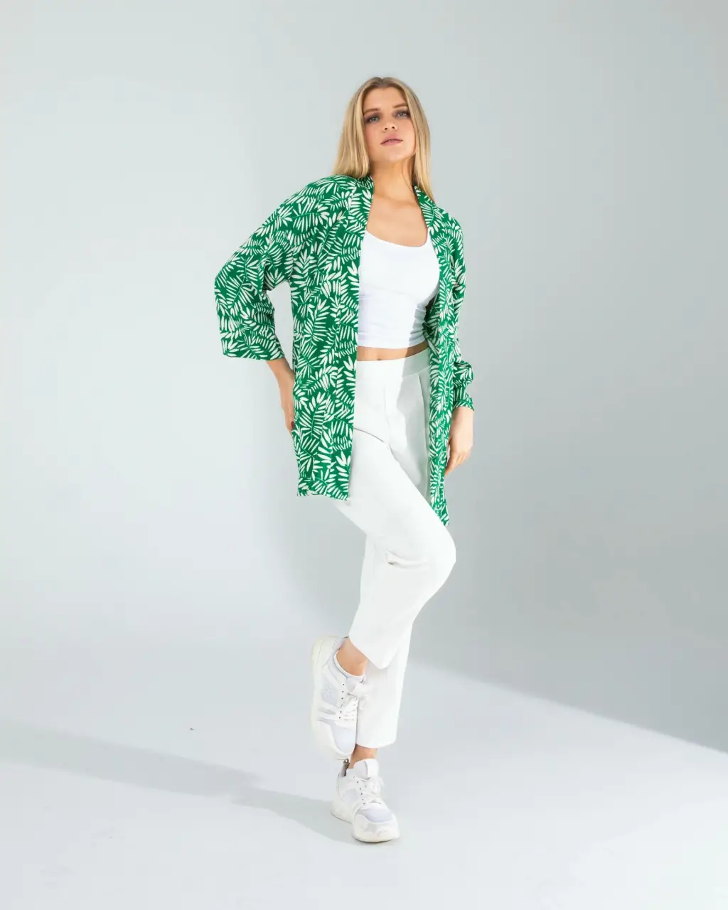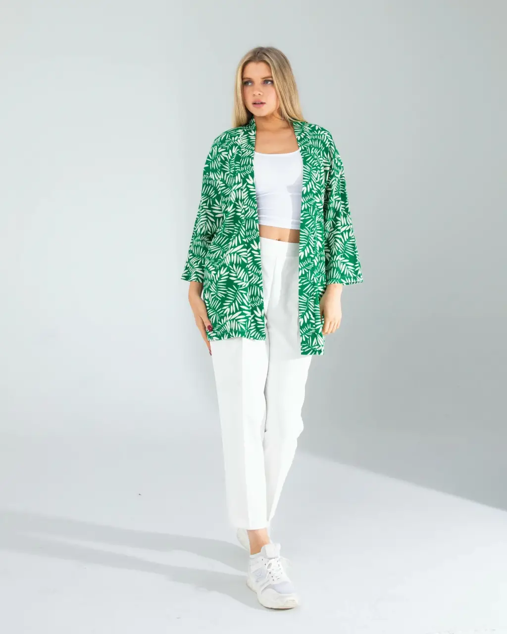 Gardırobunuza zarif ve feminen bir dokunuş katmak için ideal olan çiçek desenli yeşil kimono ile tanışın! Bu şık ve hafif kimono, moda trendlerini yakalayarak stilinize sofistike bir hava getirir. Yüksek kaliteli malzemeler kullanılarak üretilmiş olan bu kimono, hem rahatlık hem de şıklık sunar. Günlük kombinlerinizde veya özel davetlerde rahatça tercih edebileceğiniz bu yeşil kimono, zarif çiçek desenleri ile dikkat çeker. Zamansız tasarımı ve göz alıcı detayları sayesinde her mevsim rahatlıkla giyebileceğiniz bu kimono, stilinizi tam anlamıyla yansıtmanıza yardımcı olacak.