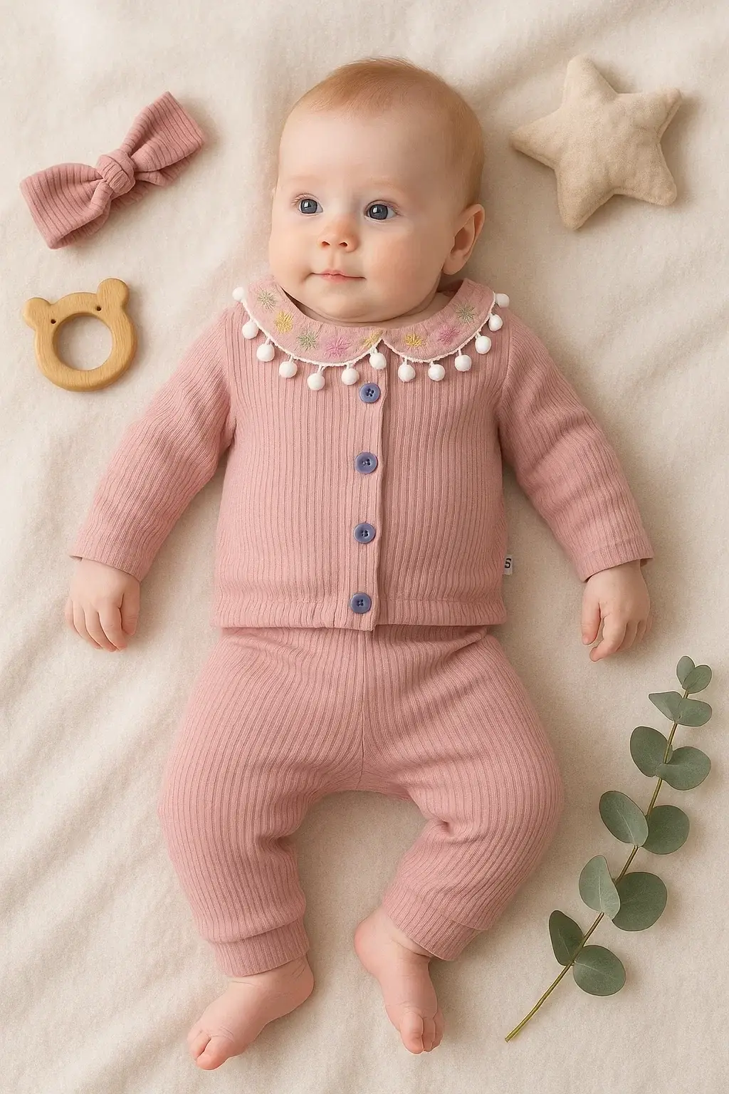 Çiçek Nakışlı Düşmeli Bandanalı Kız Bebek Takımı