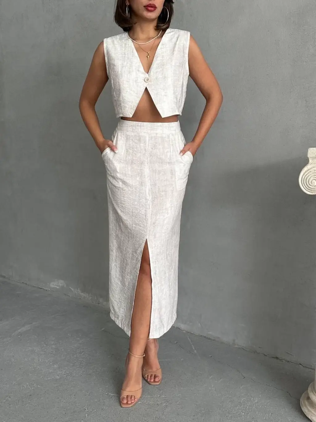 KAZAX markasının şık ve zarif tasarımıyla öne çıkan çilek takımı, etek ve yelek kombinasyonuyla dikkat çekiyor.