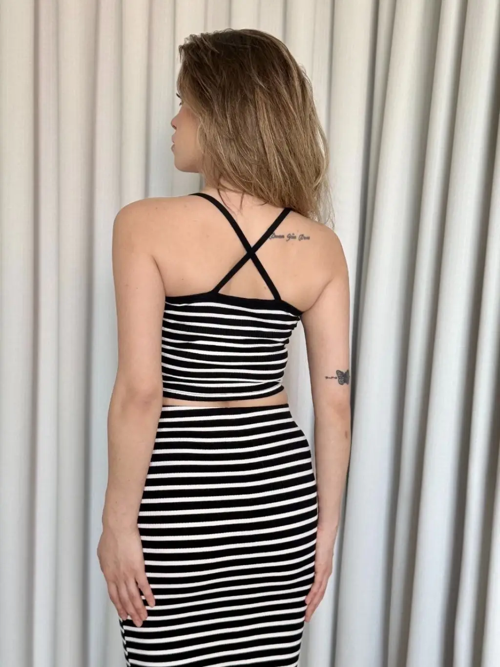 Şıklık ve rahatlığı bir arada sunan çizgili etek crop takım, gardırobunuzun vazgeçilmezi olmaya aday!